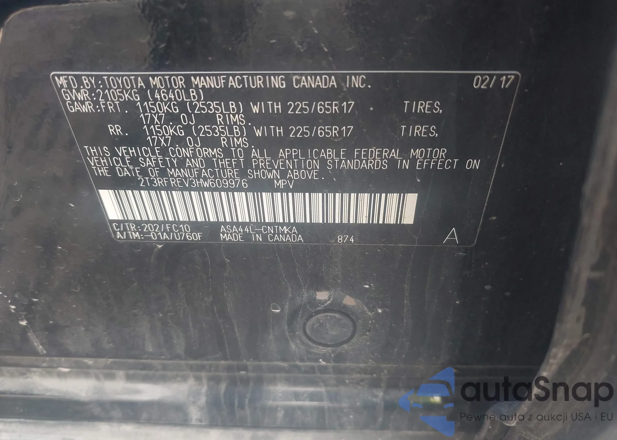 LOT: 42486255 VIN: 2T3RFREV3HW609976