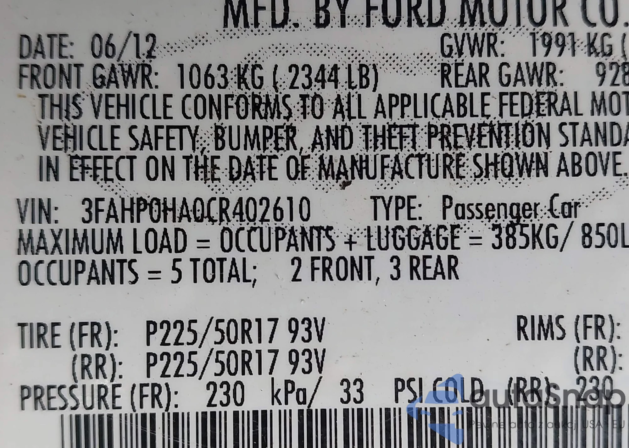 LOT: 42492610 VIN: 3FAHP0HA0CR402610