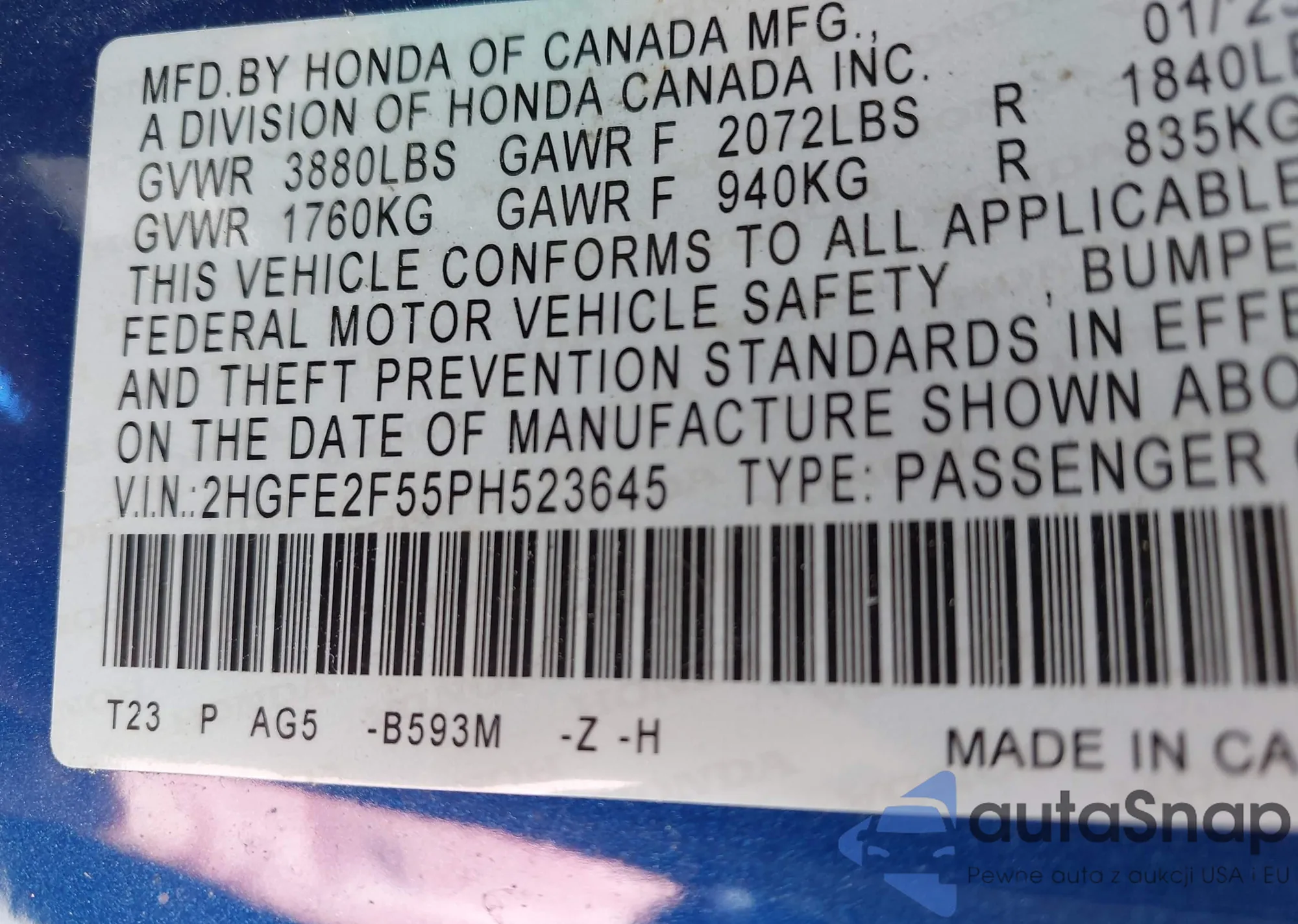 • VIN 2HGFE2F55PH523645