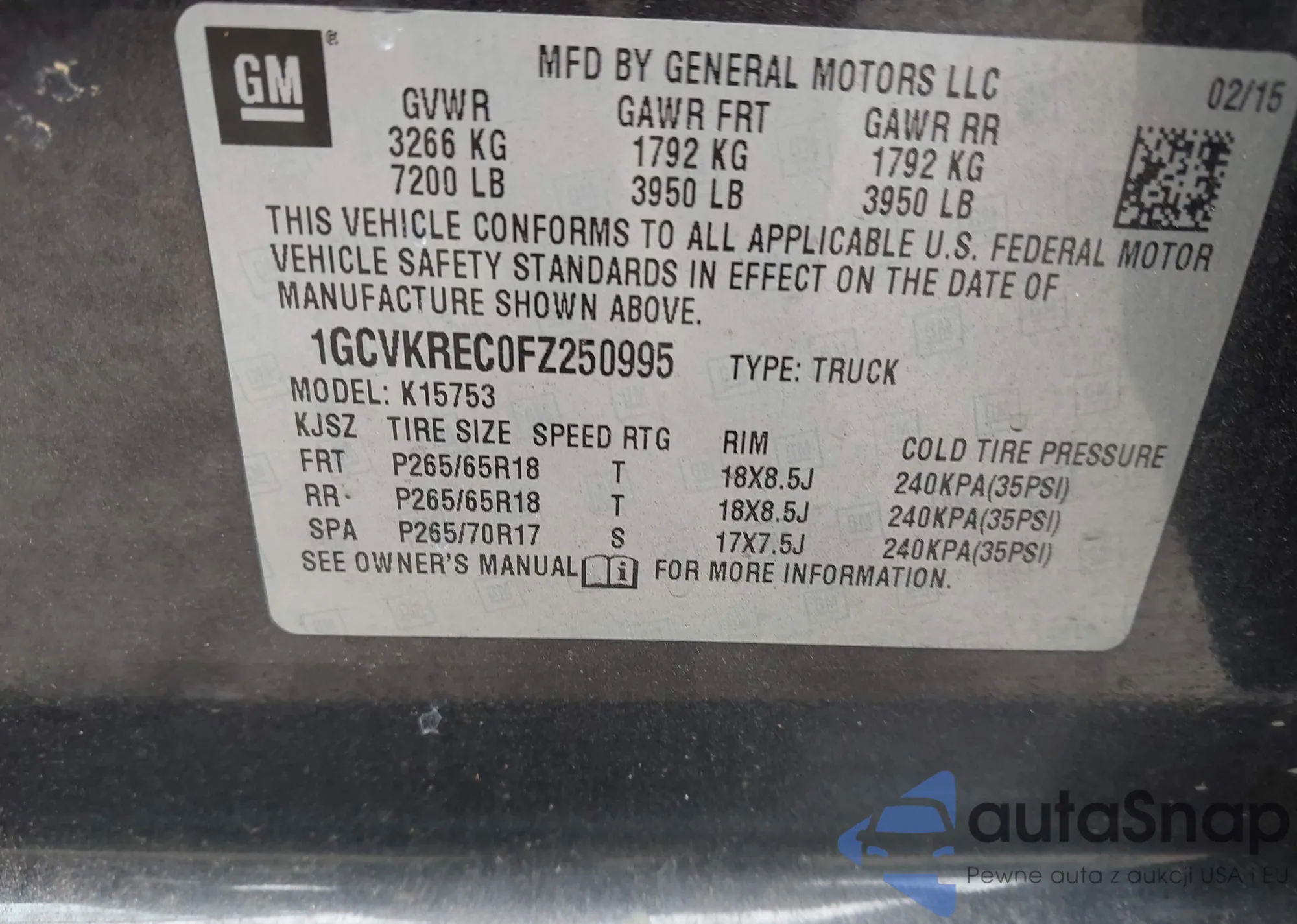 LOT: 42988468 VIN: 1GCVKREC0FZ250995