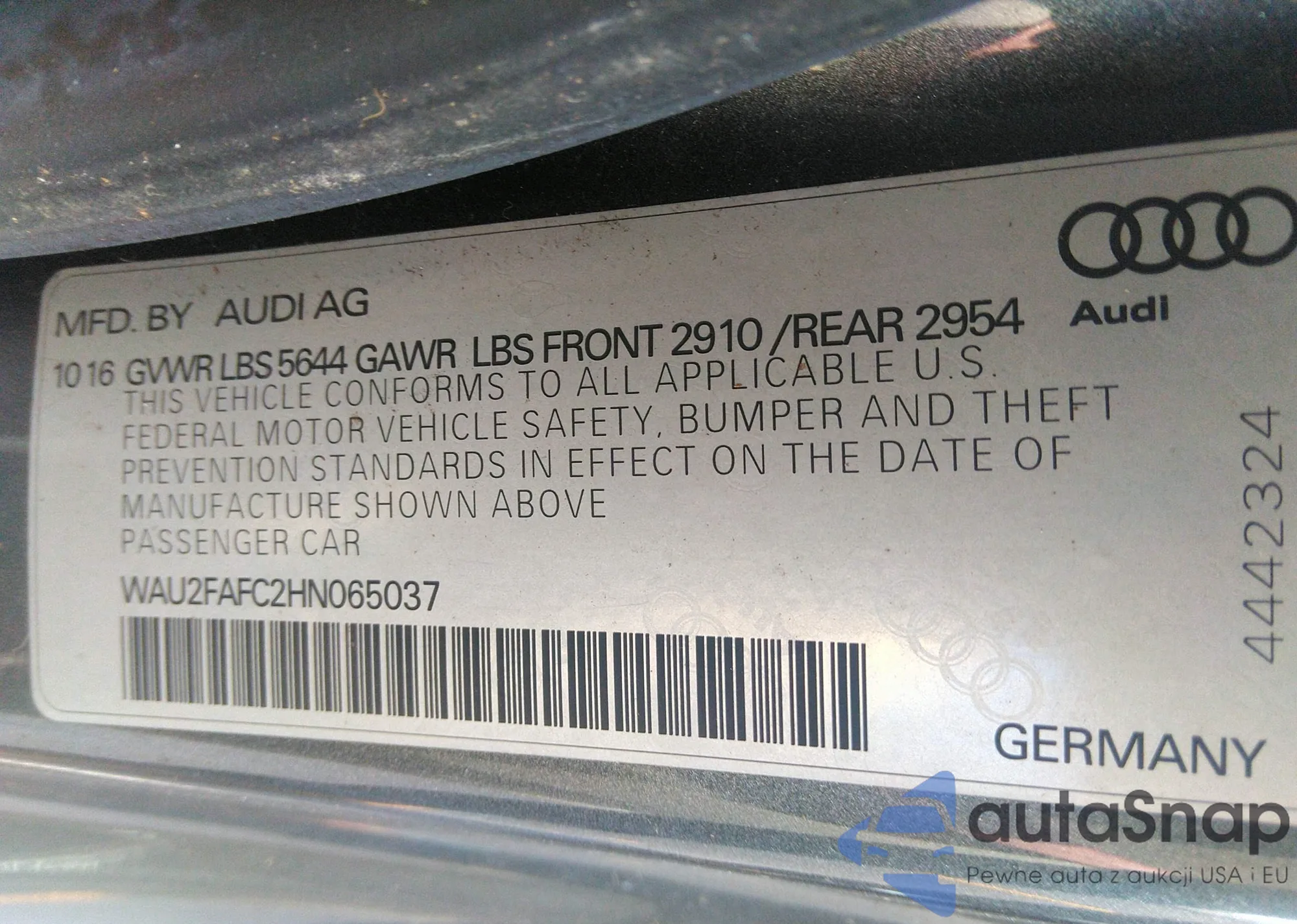 LOT: 42854363 VIN: WAU2FAFC2HN065037
