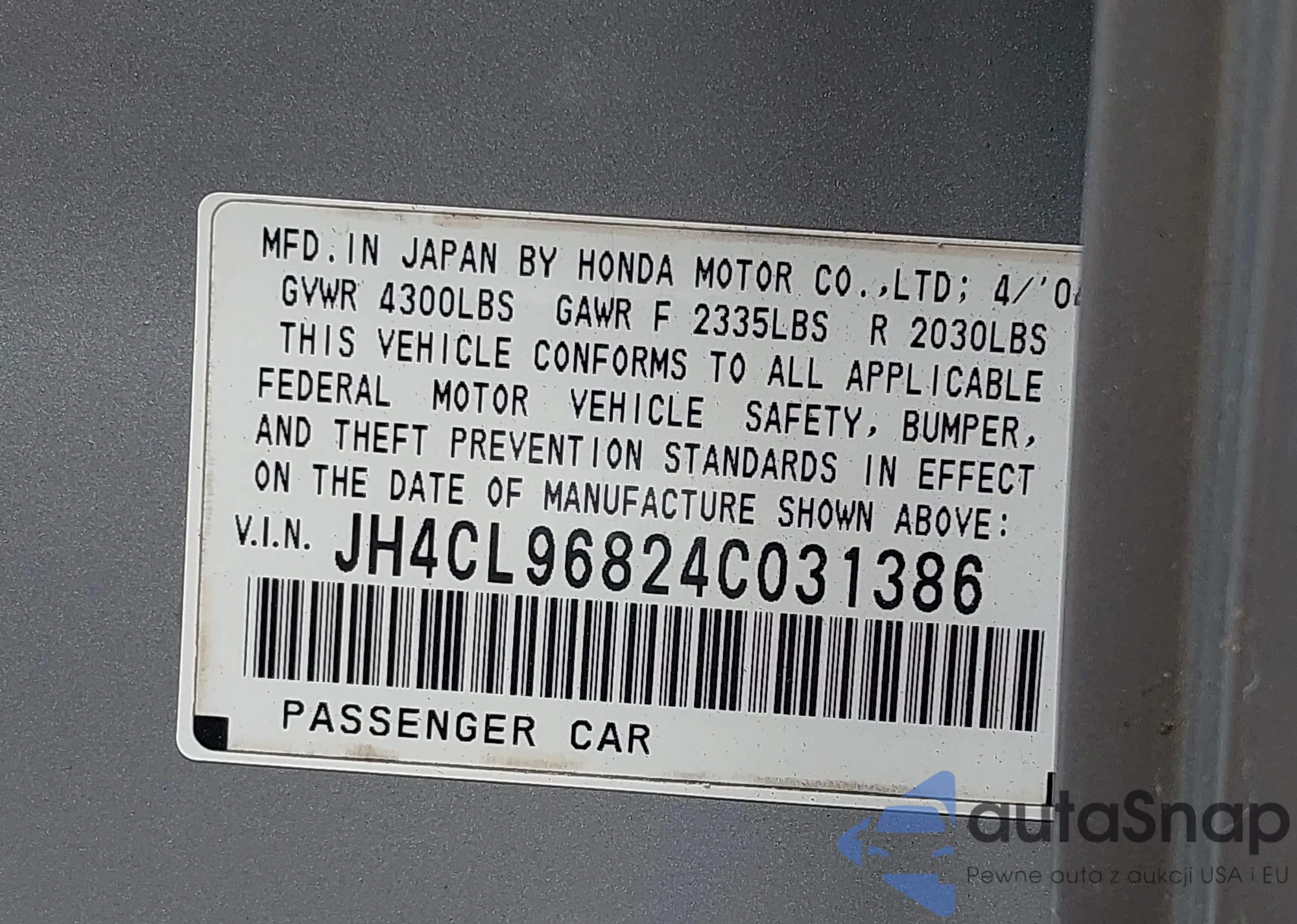 LOT: 42868232 VIN: JH4CL96824C031386