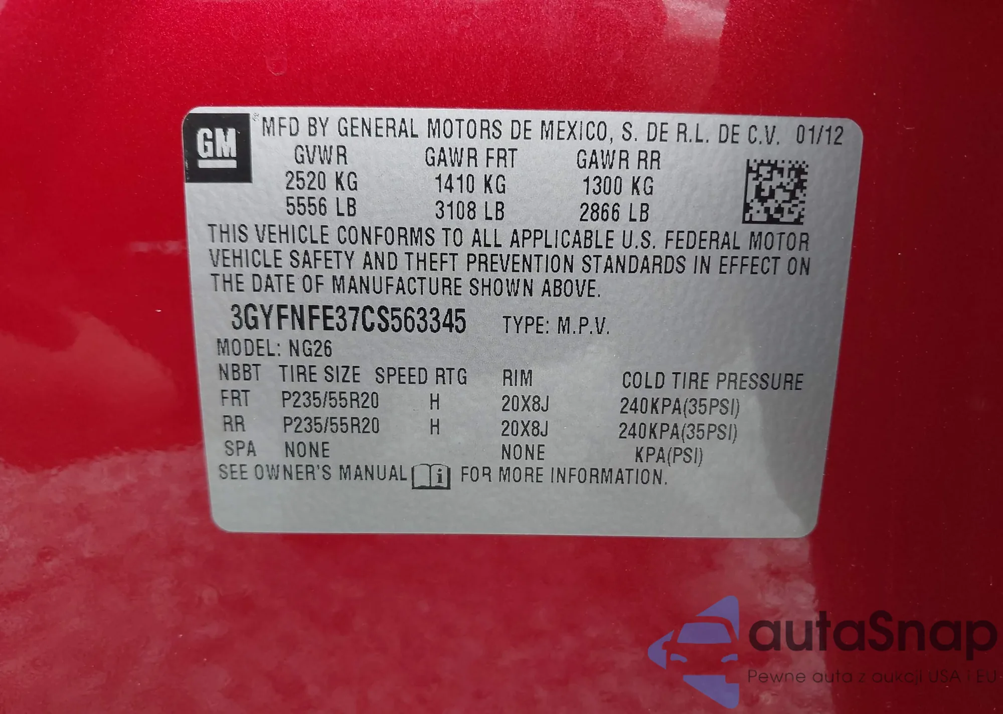 LOT: 43183399 VIN: 3GYFNFE37CS563345