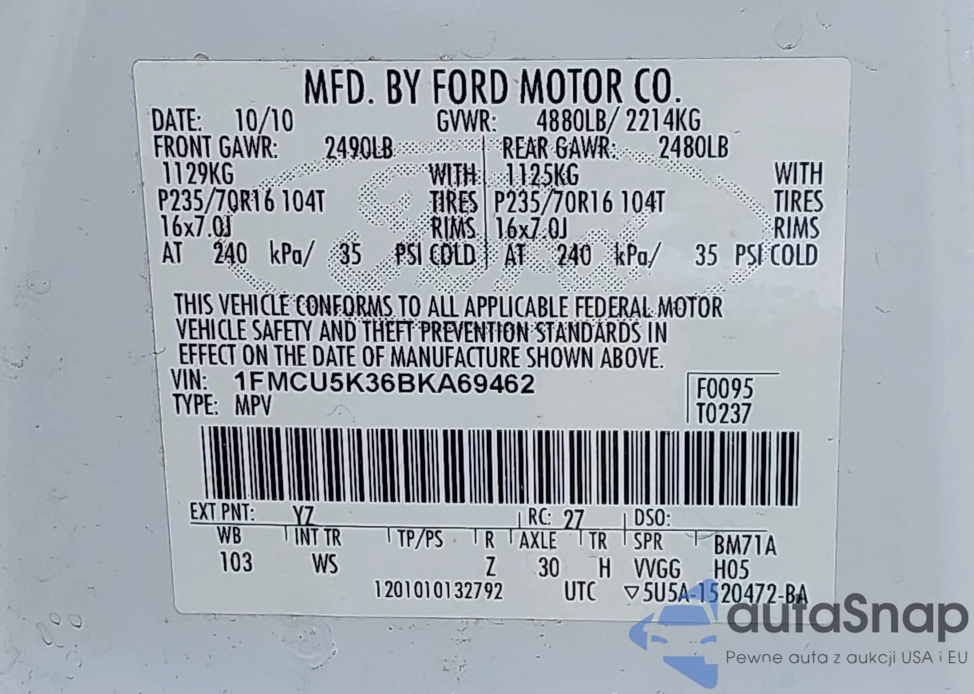 LOT: 43142828 VIN: 1ZVBP8AN3A5129204