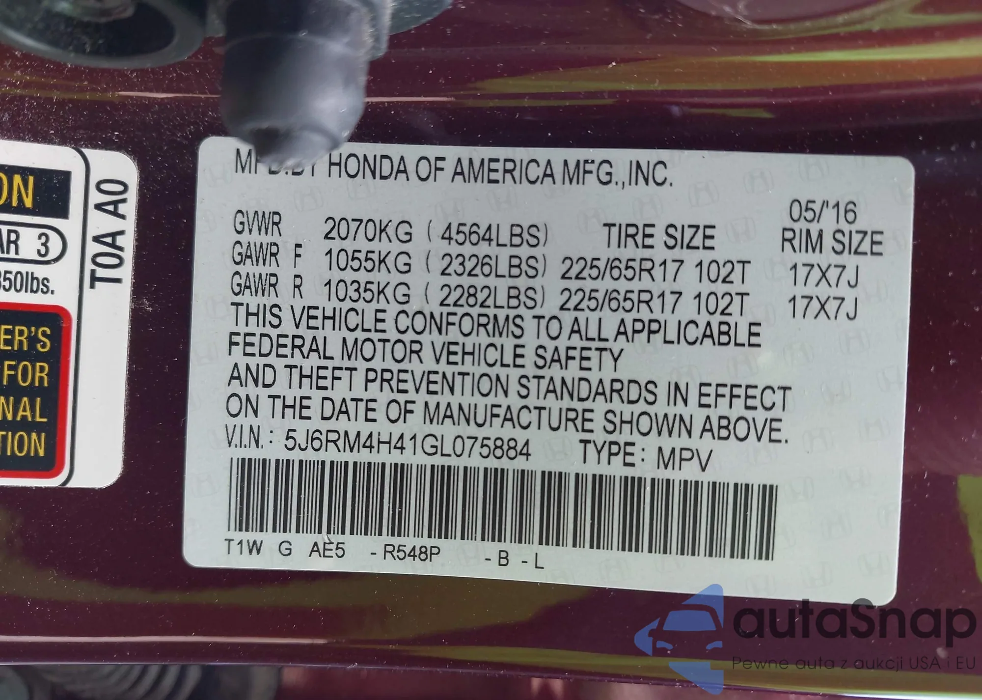 • VIN 5J6RM4H41GL075884
