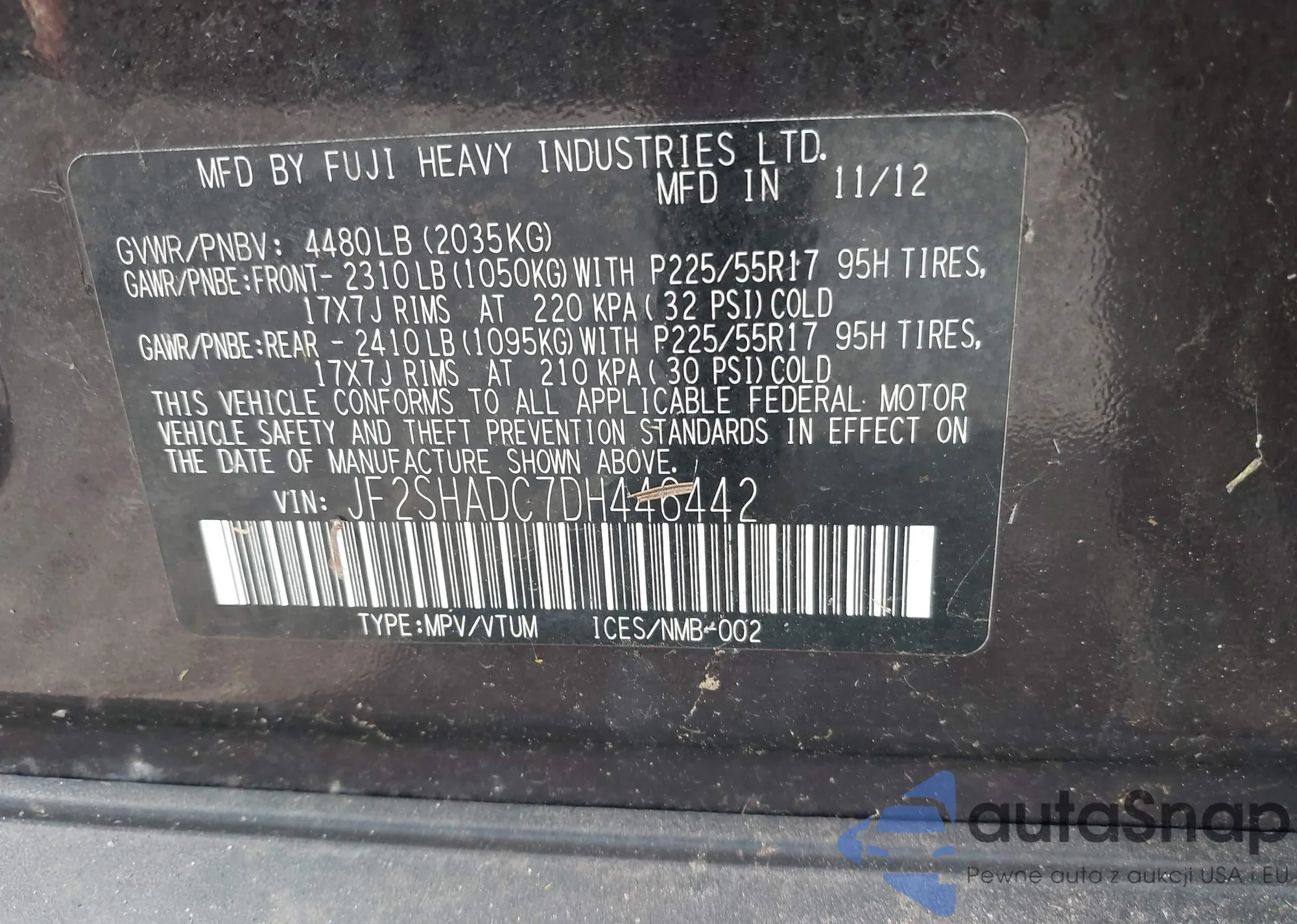 LOT: 43163090 VIN: JF2SHADC7DH446442