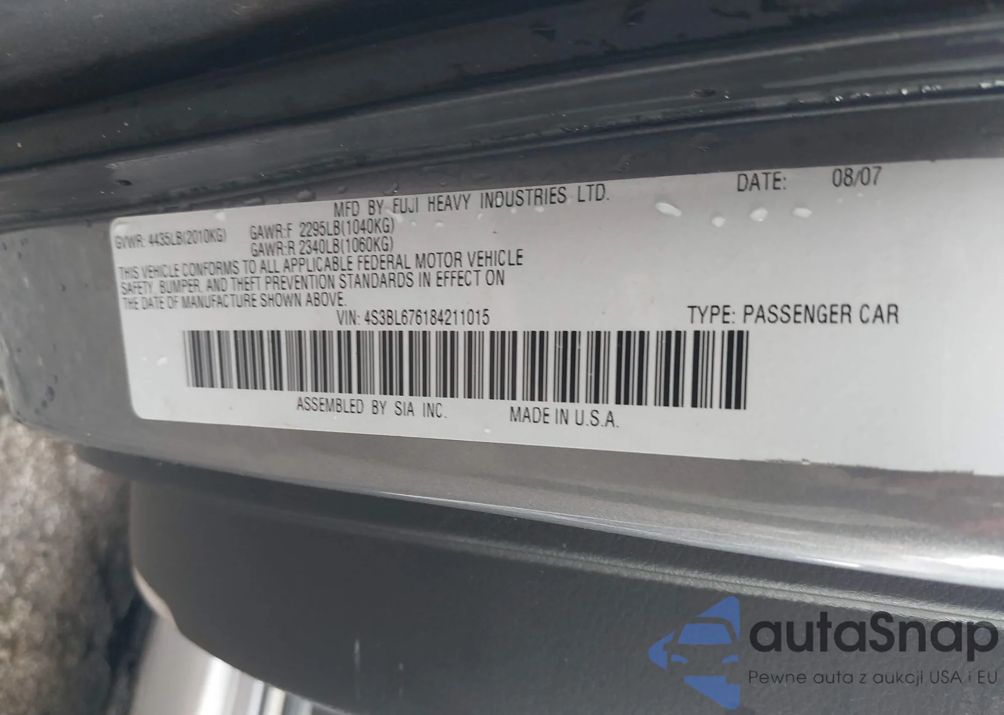 LOT: 43087839 VIN: 4S3BL676184211015
