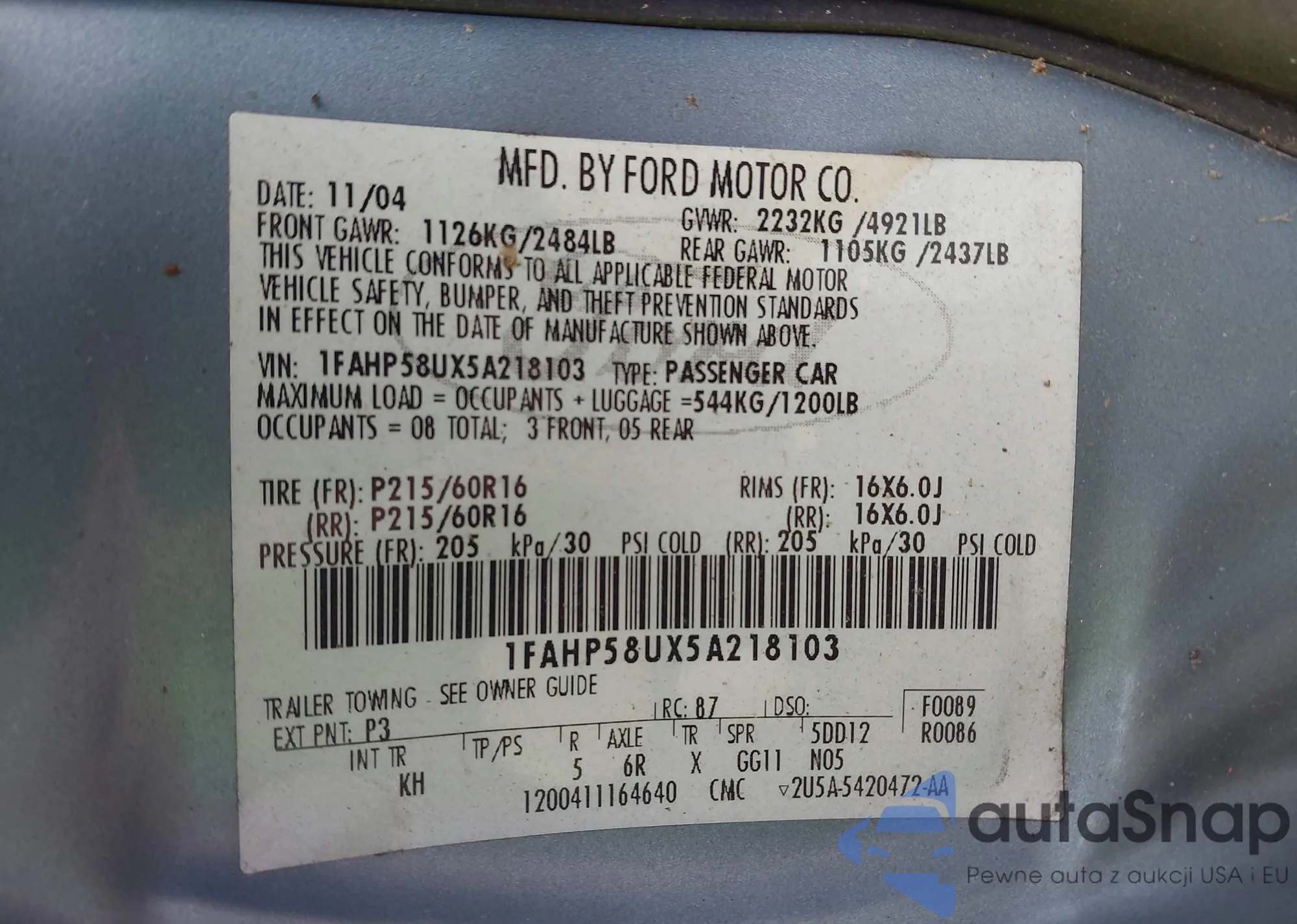 LOT: 43221003 VIN: 1FAFP37NX7W300523