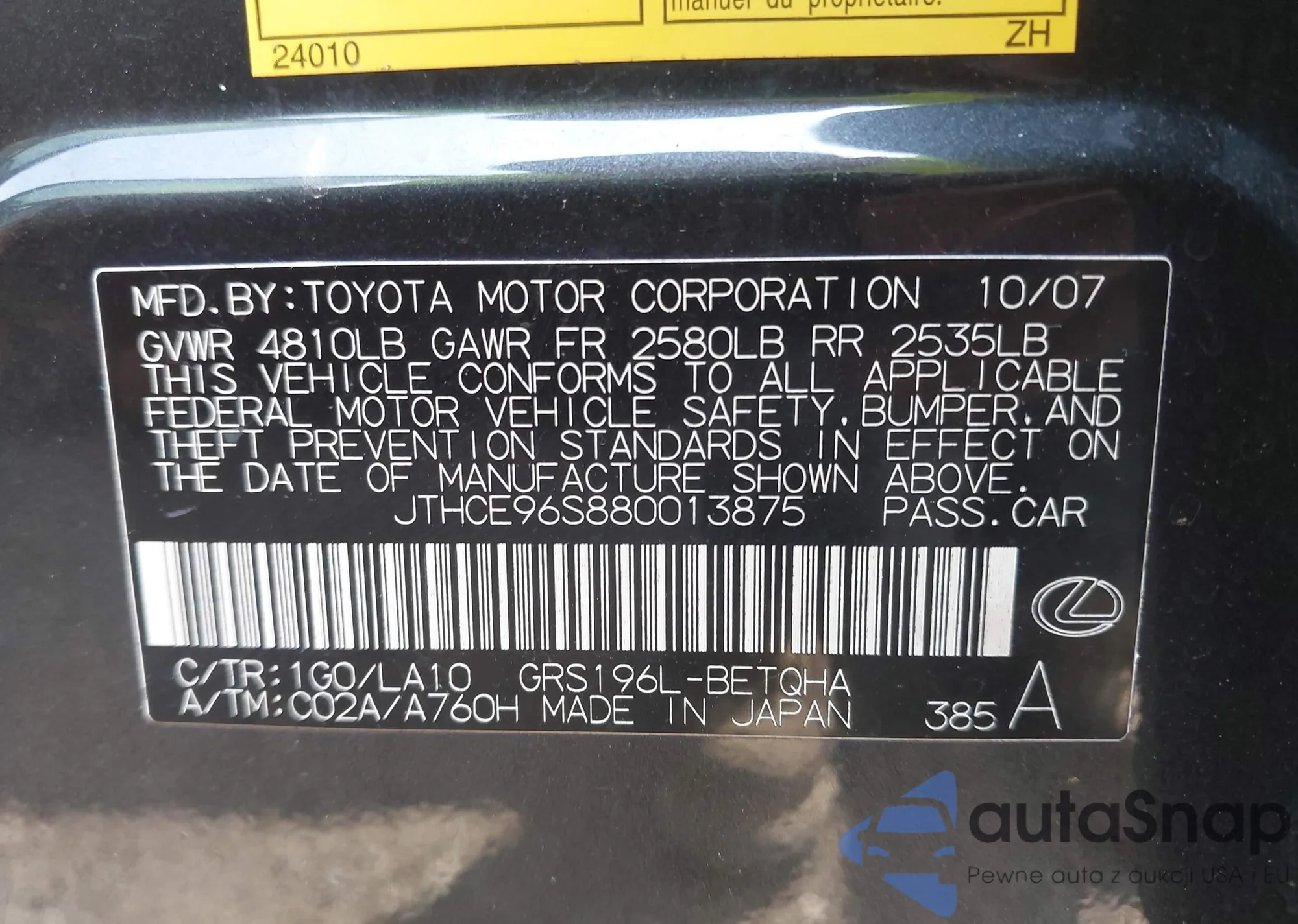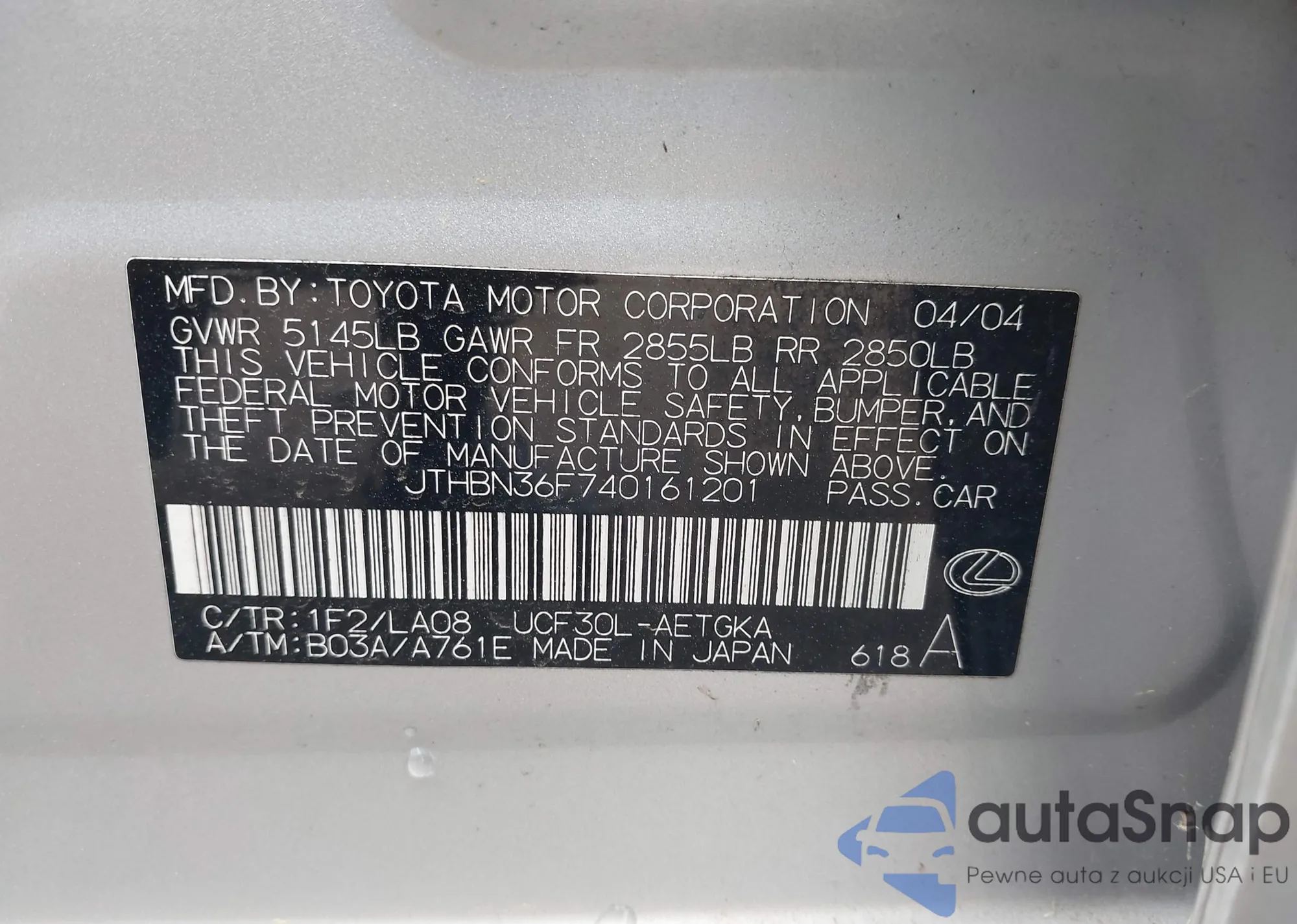 LOT: 43244937 VIN: JF1SG65683H770074