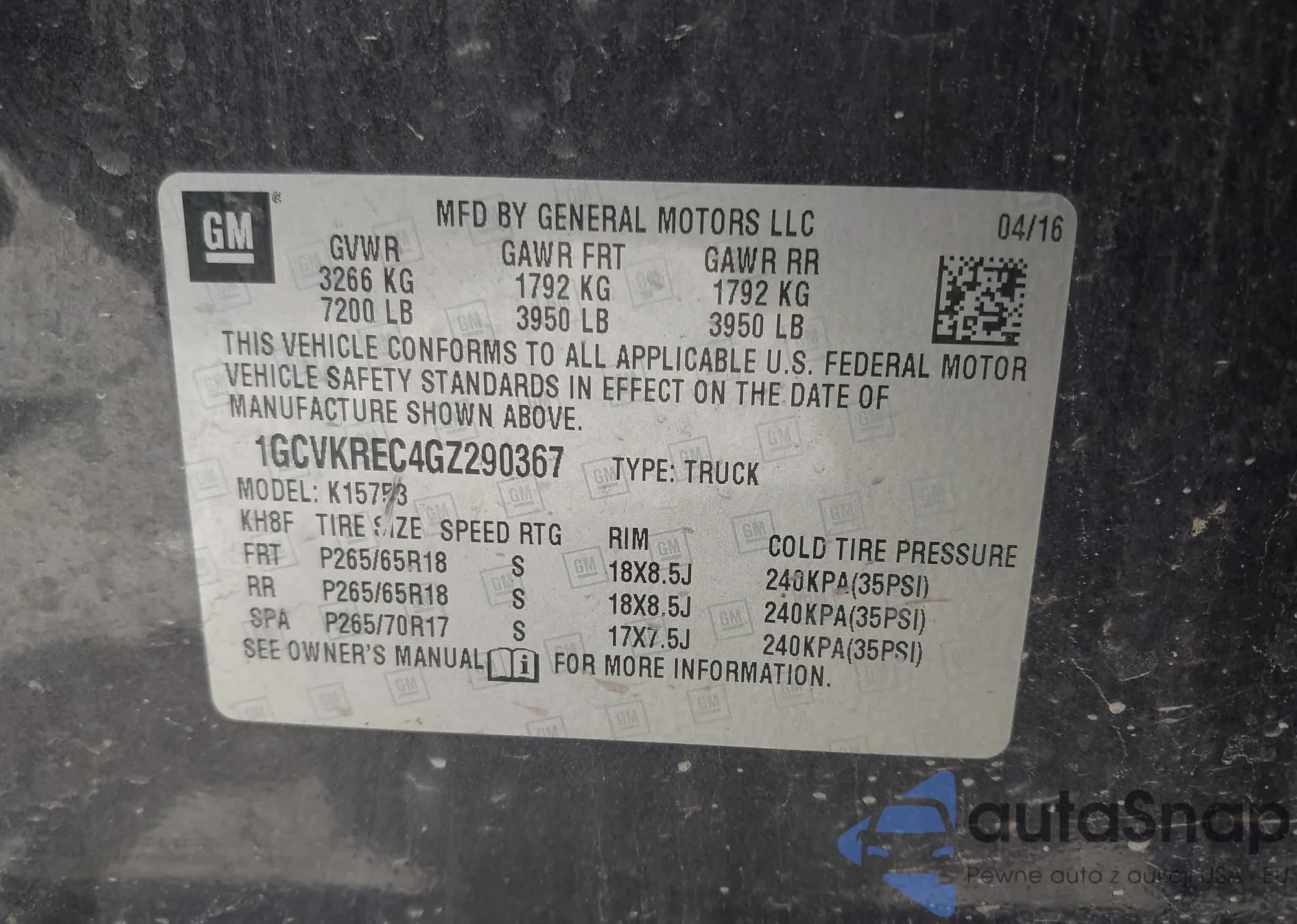 LOT: 43015726 VIN: 1GCVKREC4GZ290367