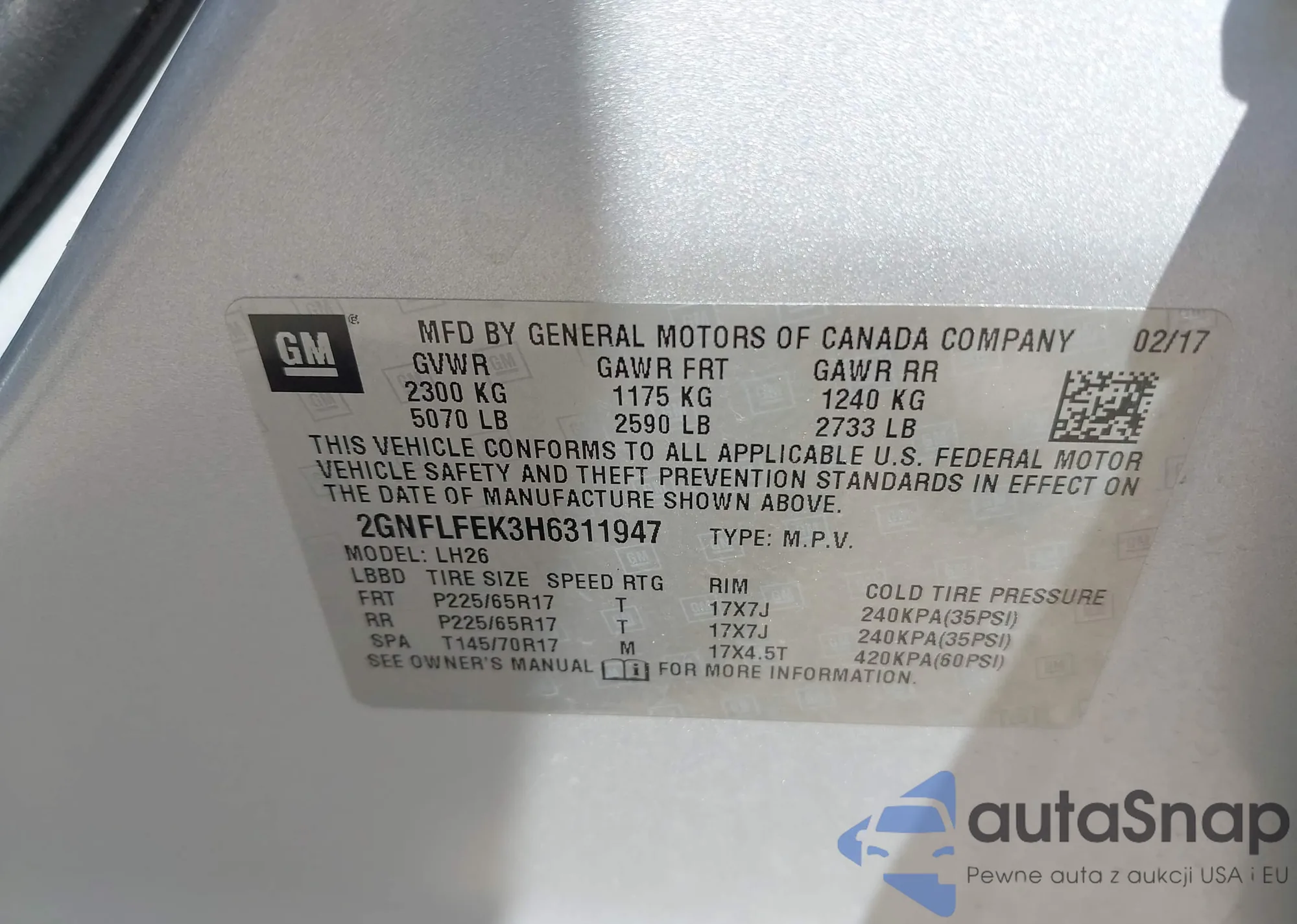• VIN 2GNFLFEK3H6311947
