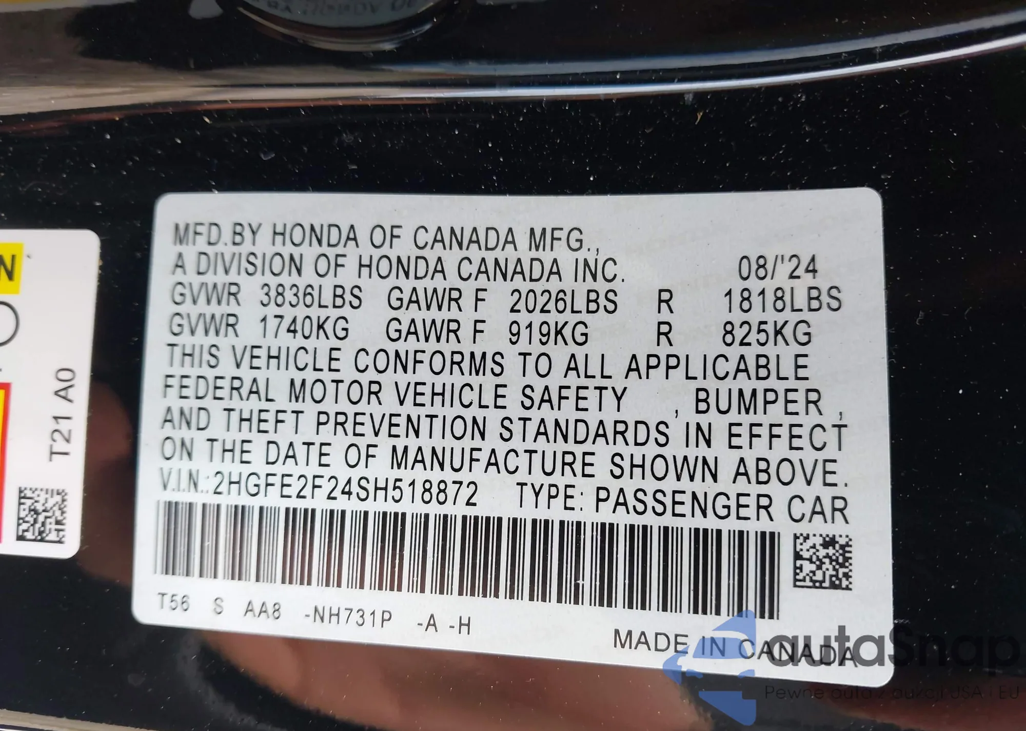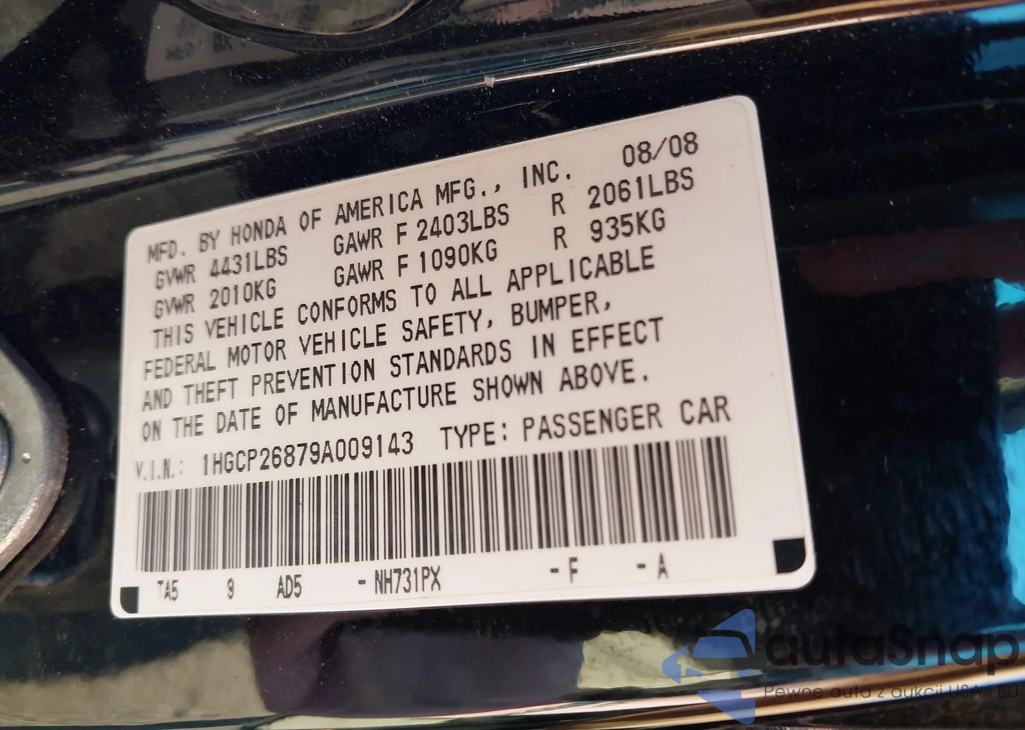 LOT: 43106670 VIN: 1HGCP26879A009143