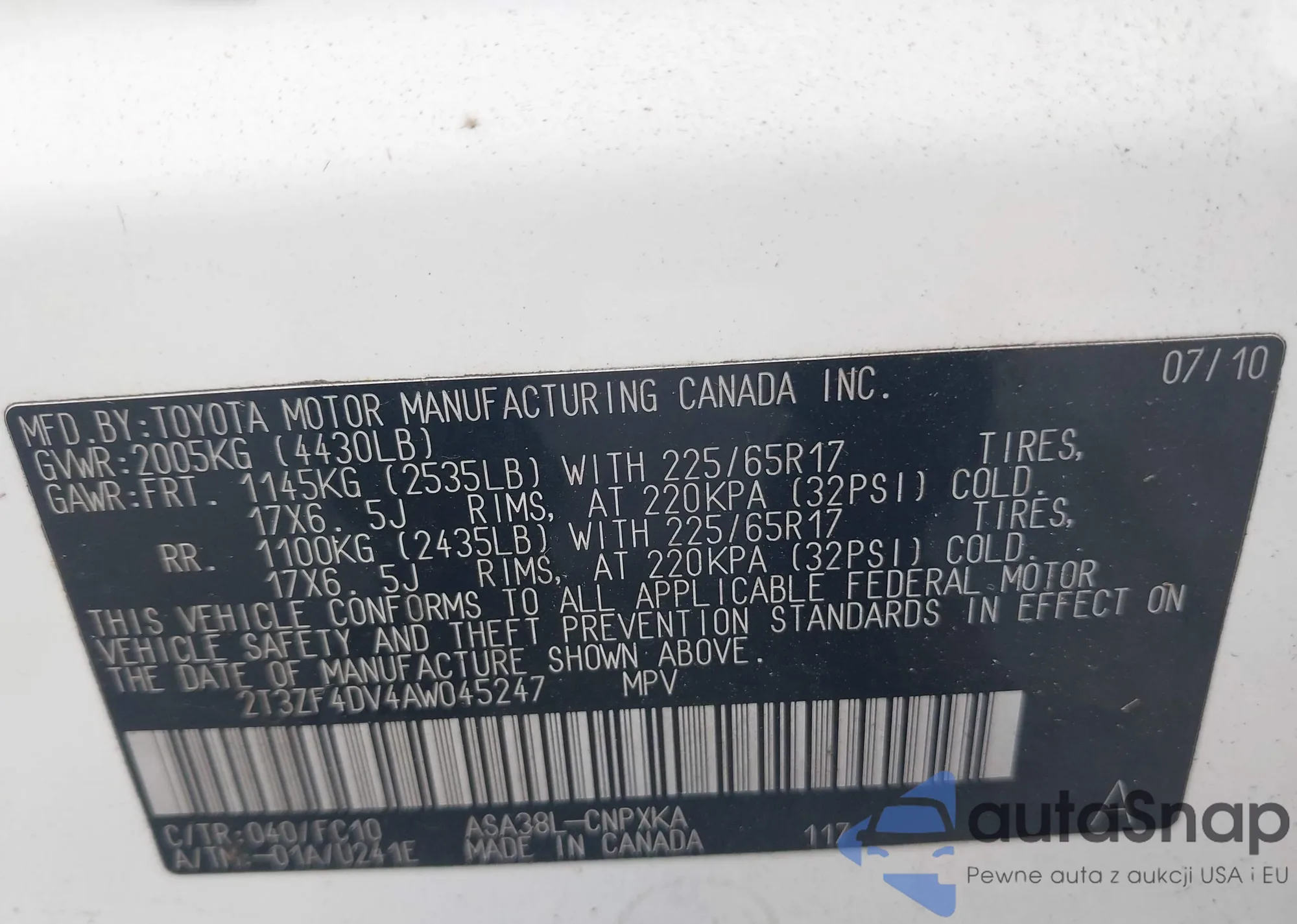 • VIN 2T3ZF4DV4AW045247