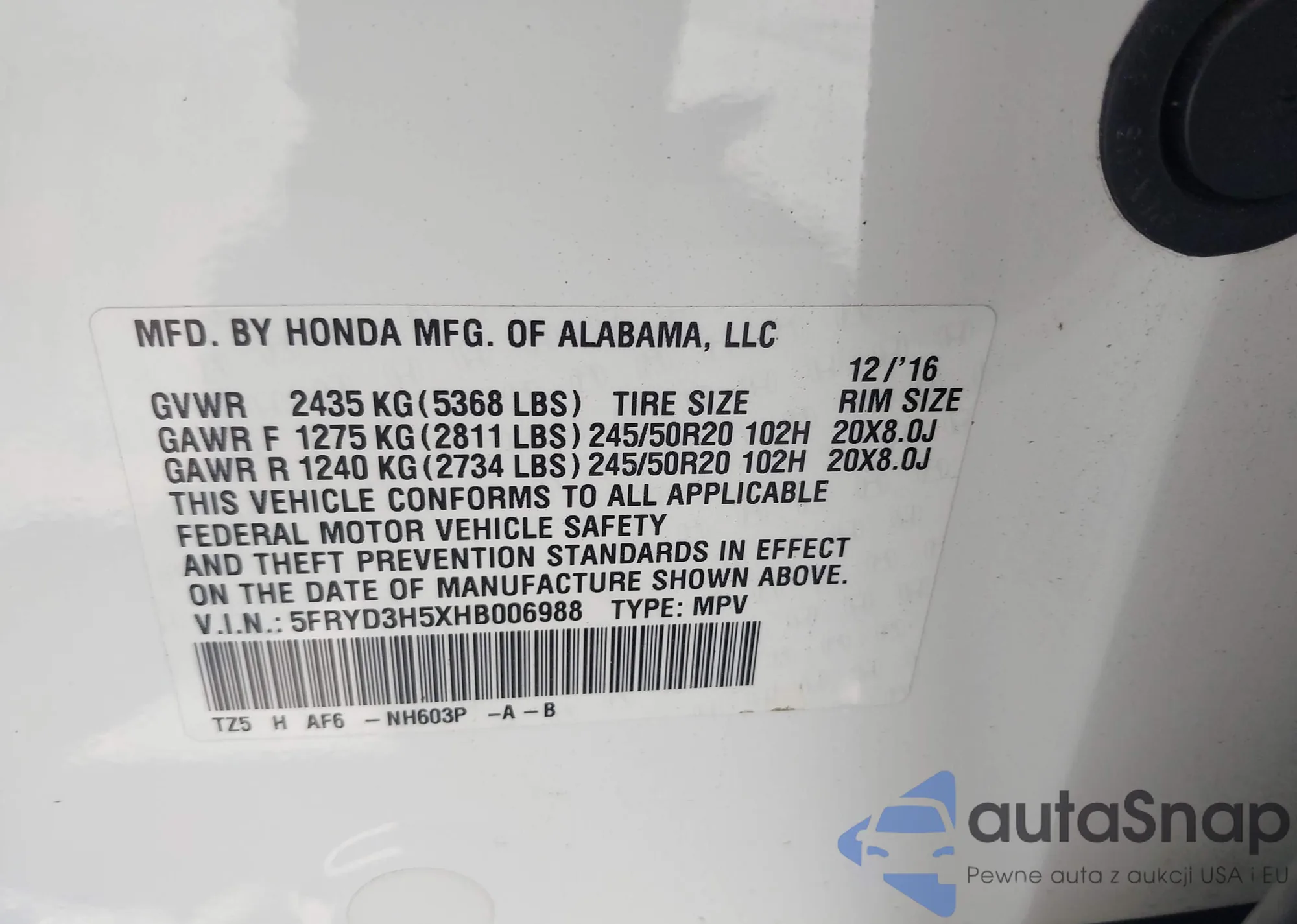 • VIN 5FRYD3H5XHB006988