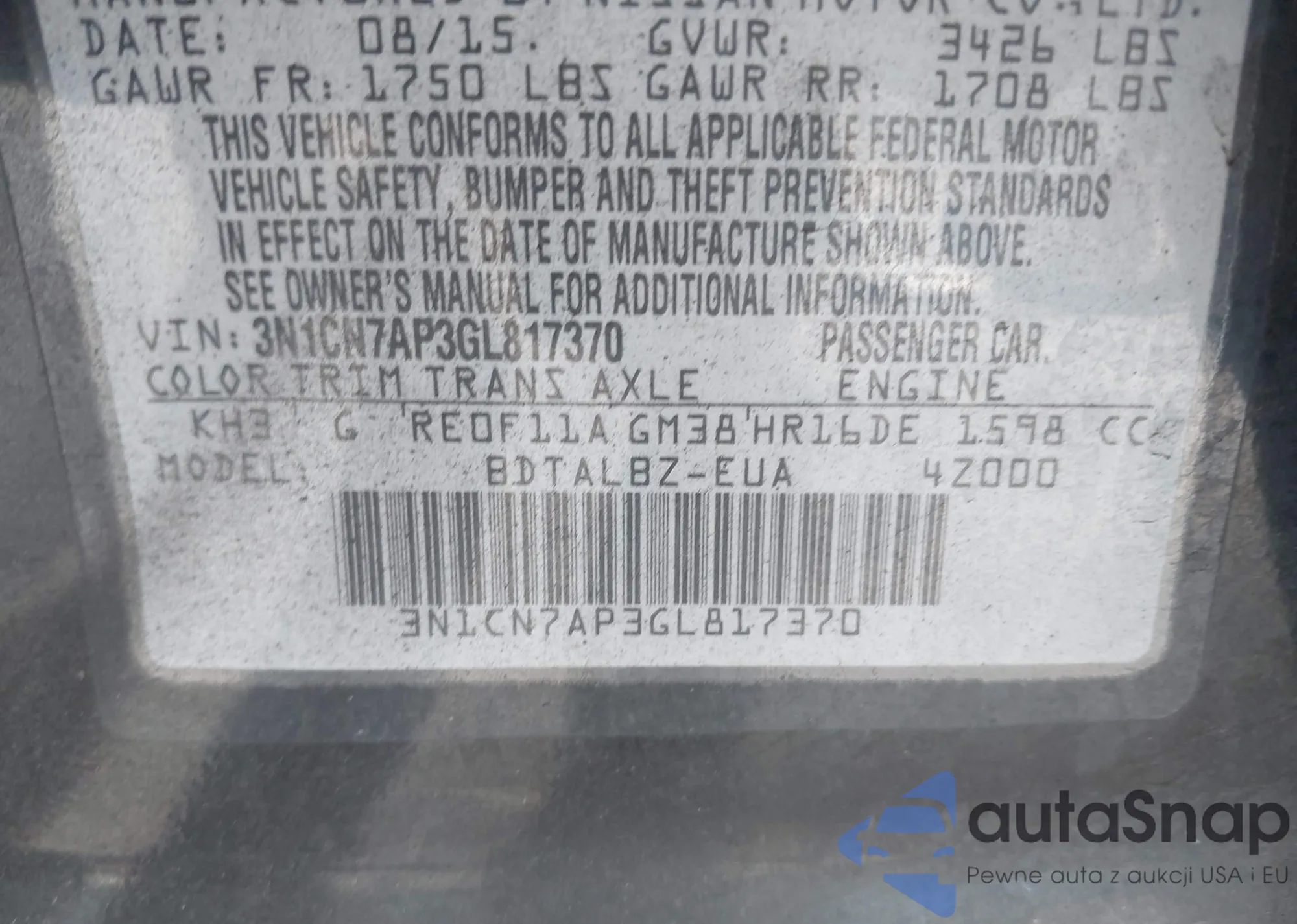 LOT: 42918368 VIN: 1HGCV3F17KA000334