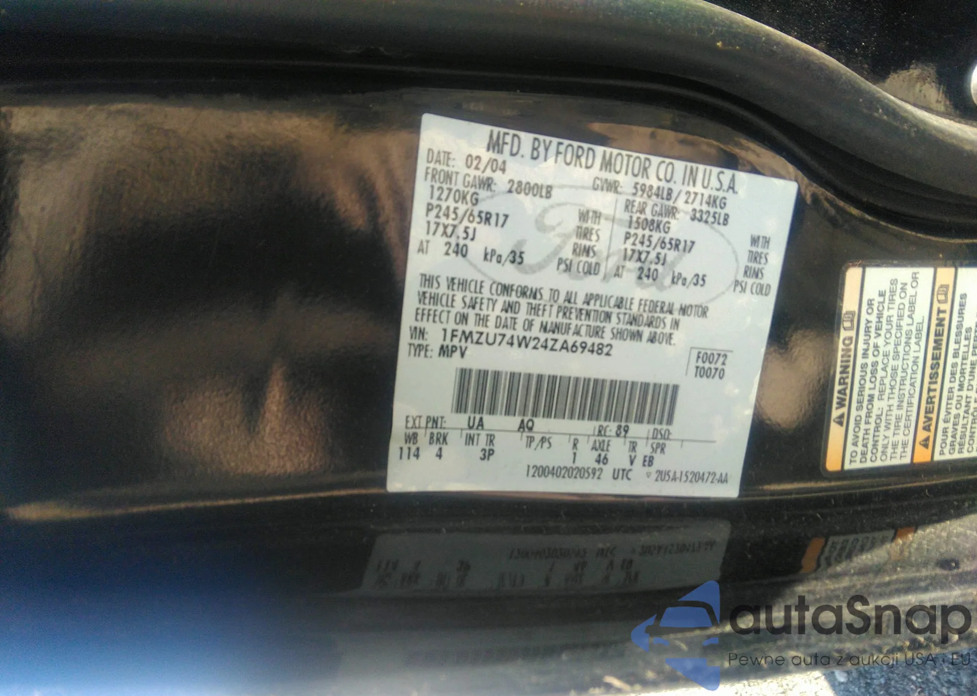 • VIN 1FMZU74W24ZA69482