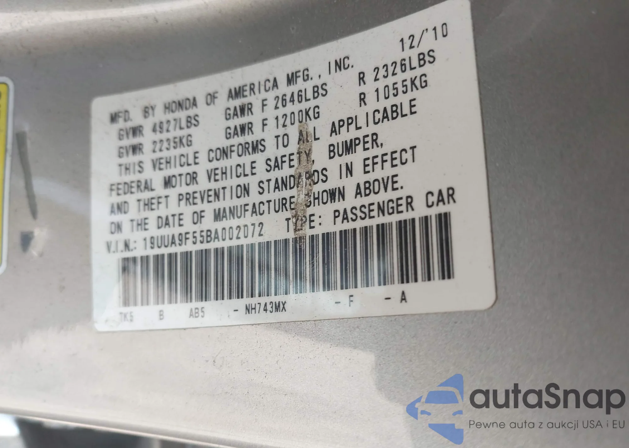 • VIN 19UUA9F55BA002072