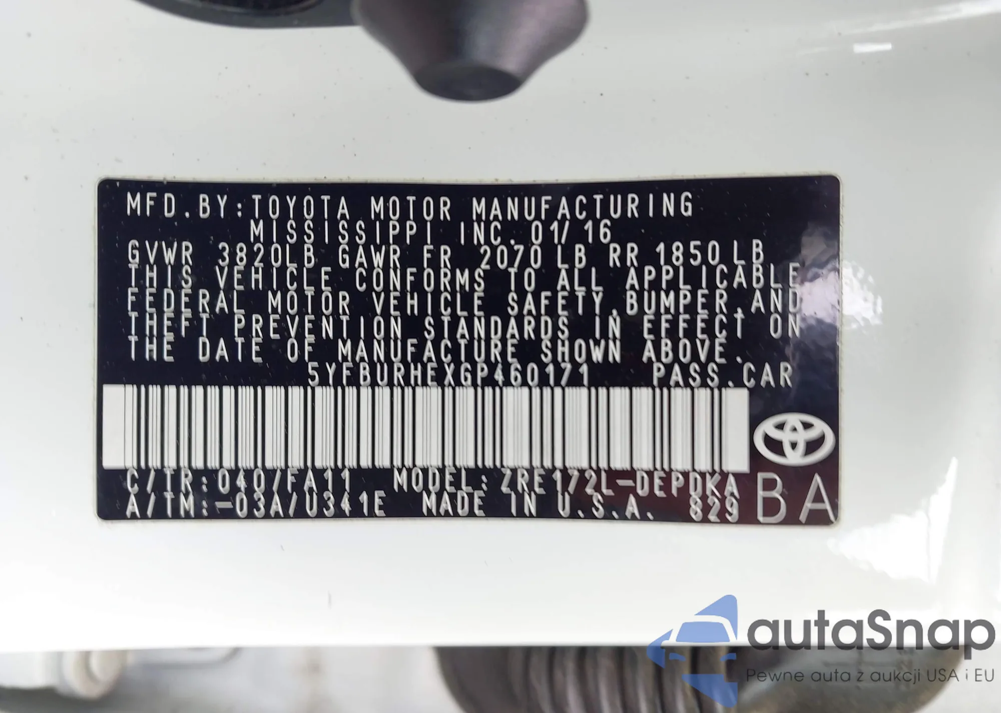 2016 Toyota Corolla L from USA, damaged, VIN 5YFBURHEXGP460171