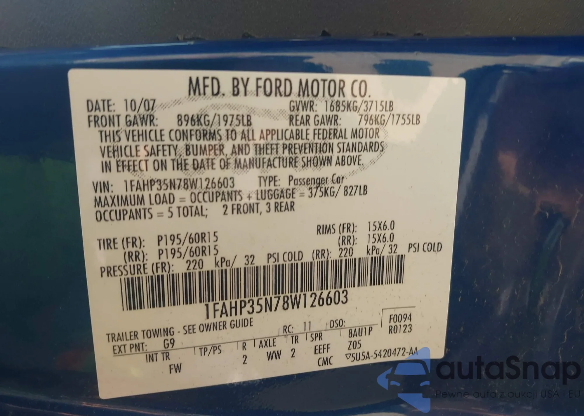 LOT: 42957335 VIN: 1FAHP35N78W126603