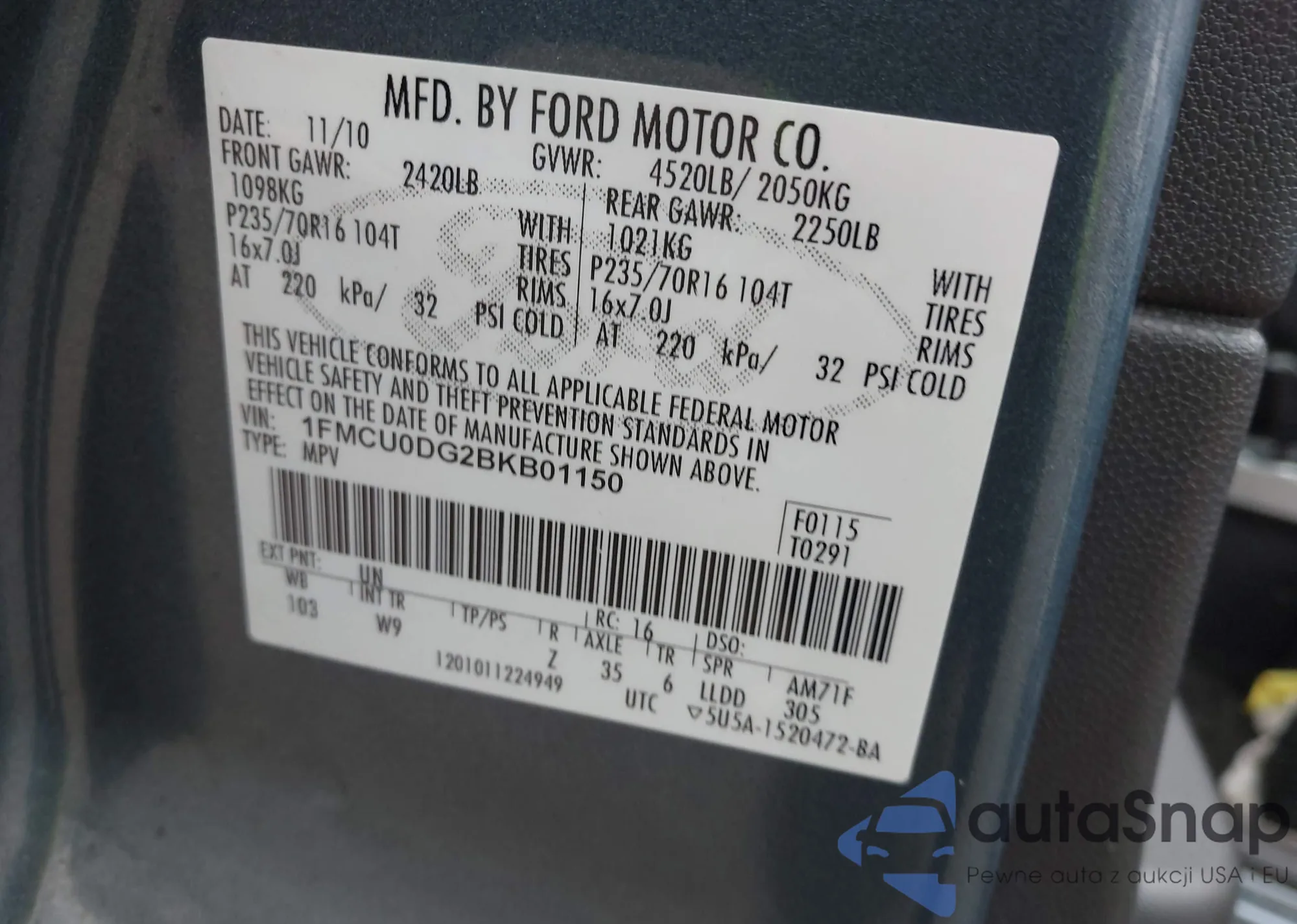 • VIN 1FMCU0DG2BKB01150