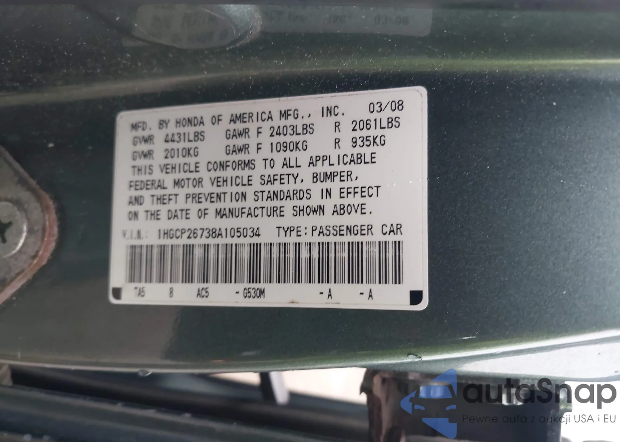 LOT: 42873418 VIN: 1HGCP26738A105034