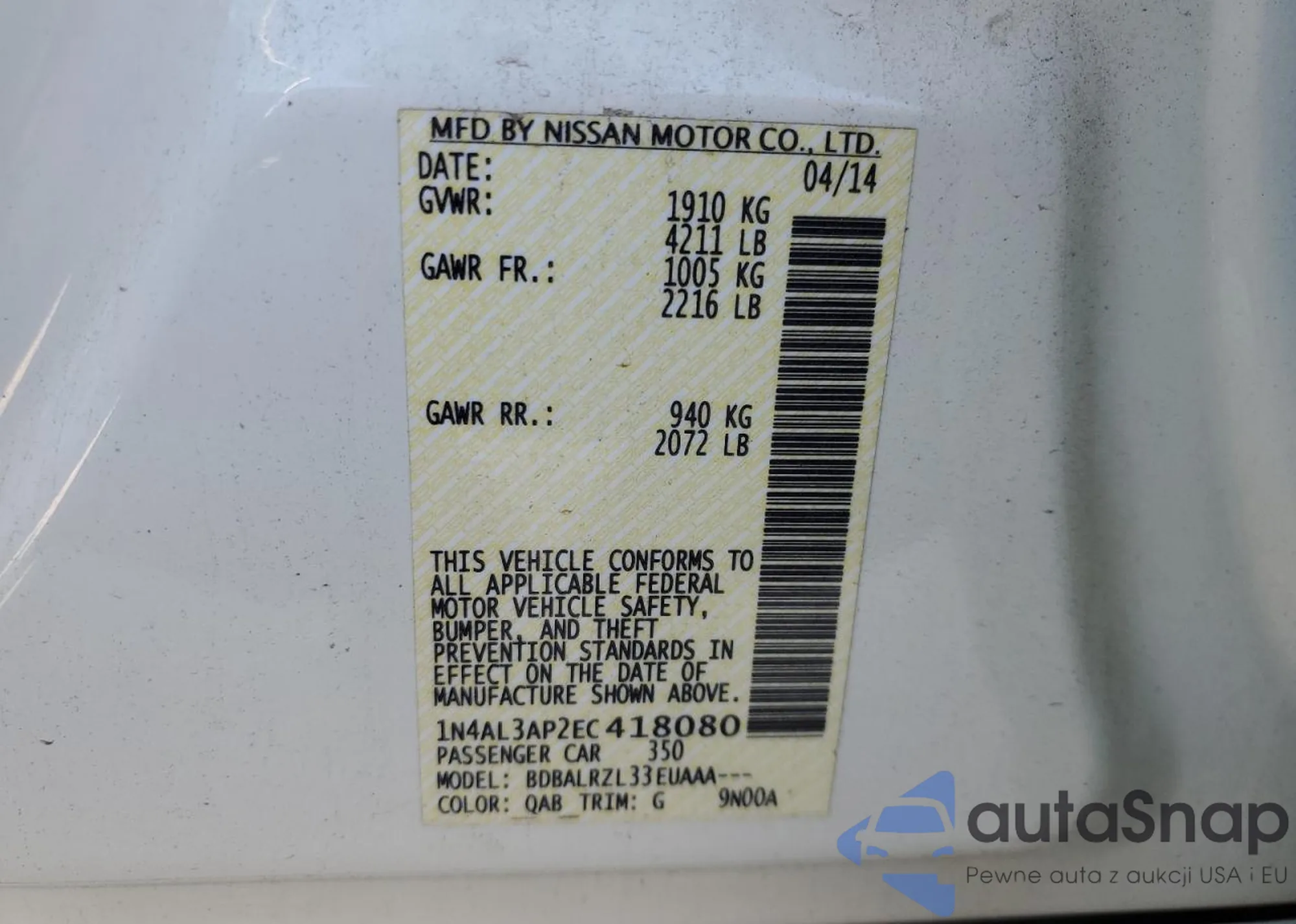 LOT: 81322405 VIN: 1N4AL3AP2EC418080