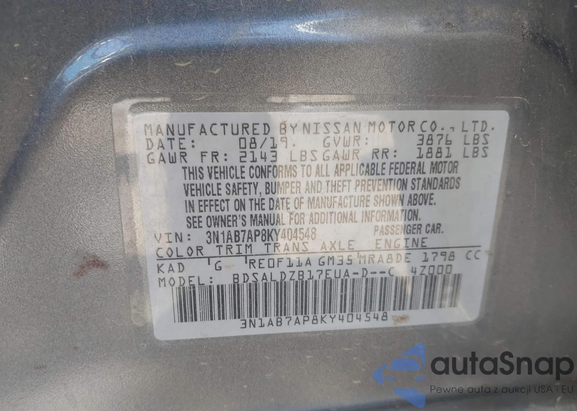 • VIN 3N1AB7AP8KY404548