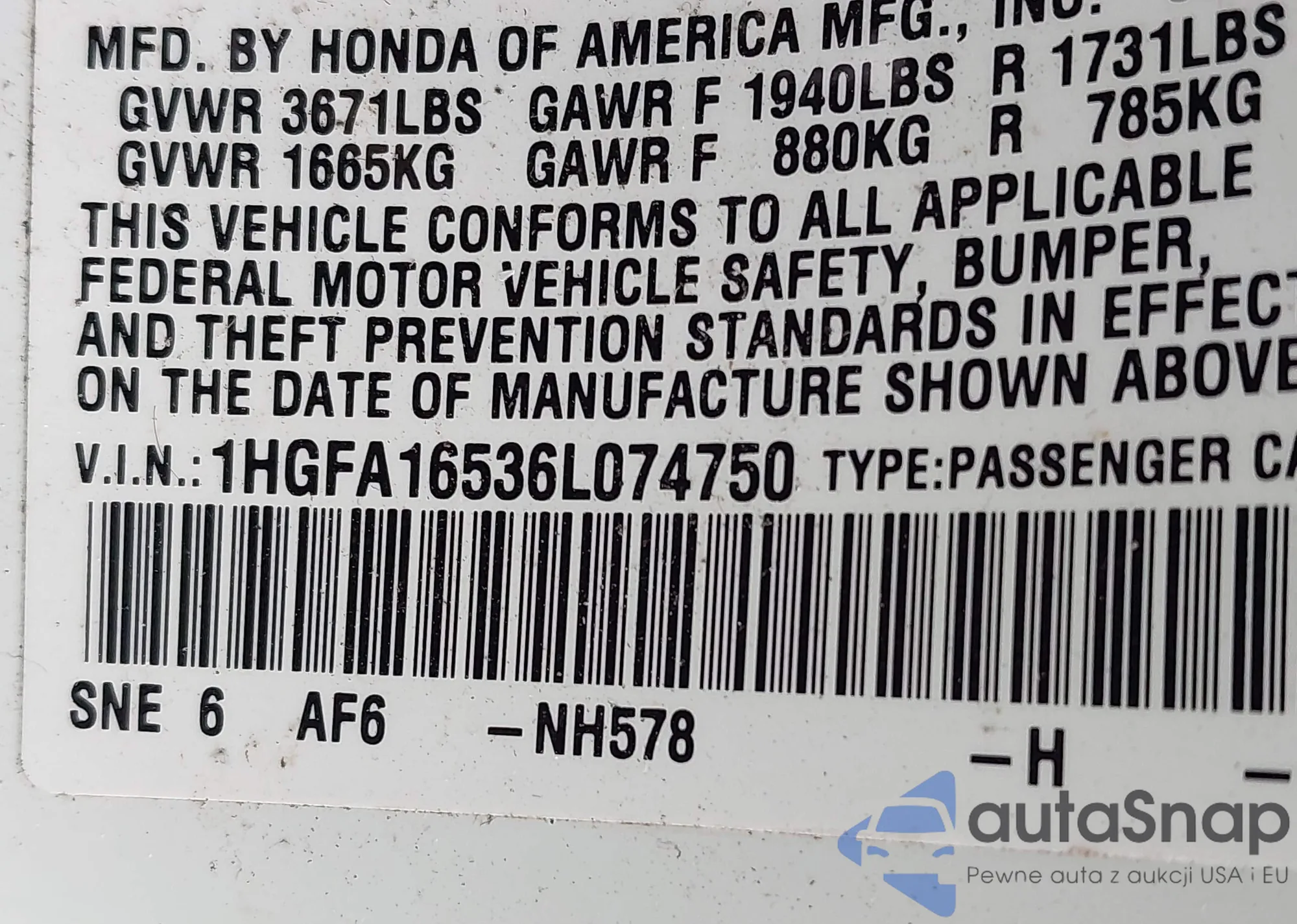 LOT: 42947233 VIN: 1HGFA16536L074750