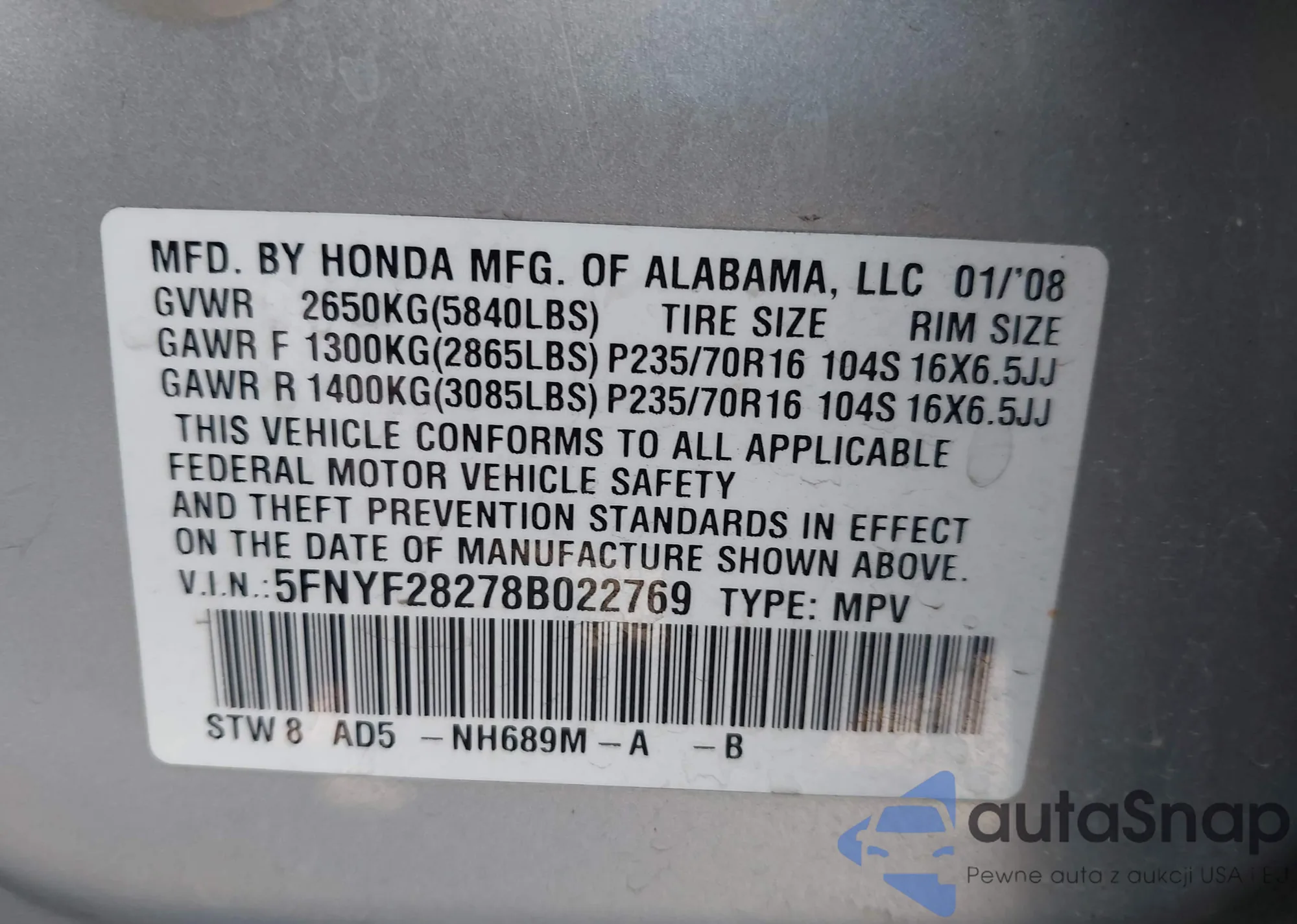 LOT: 43265905 VIN: 7FARS5H89RE012563