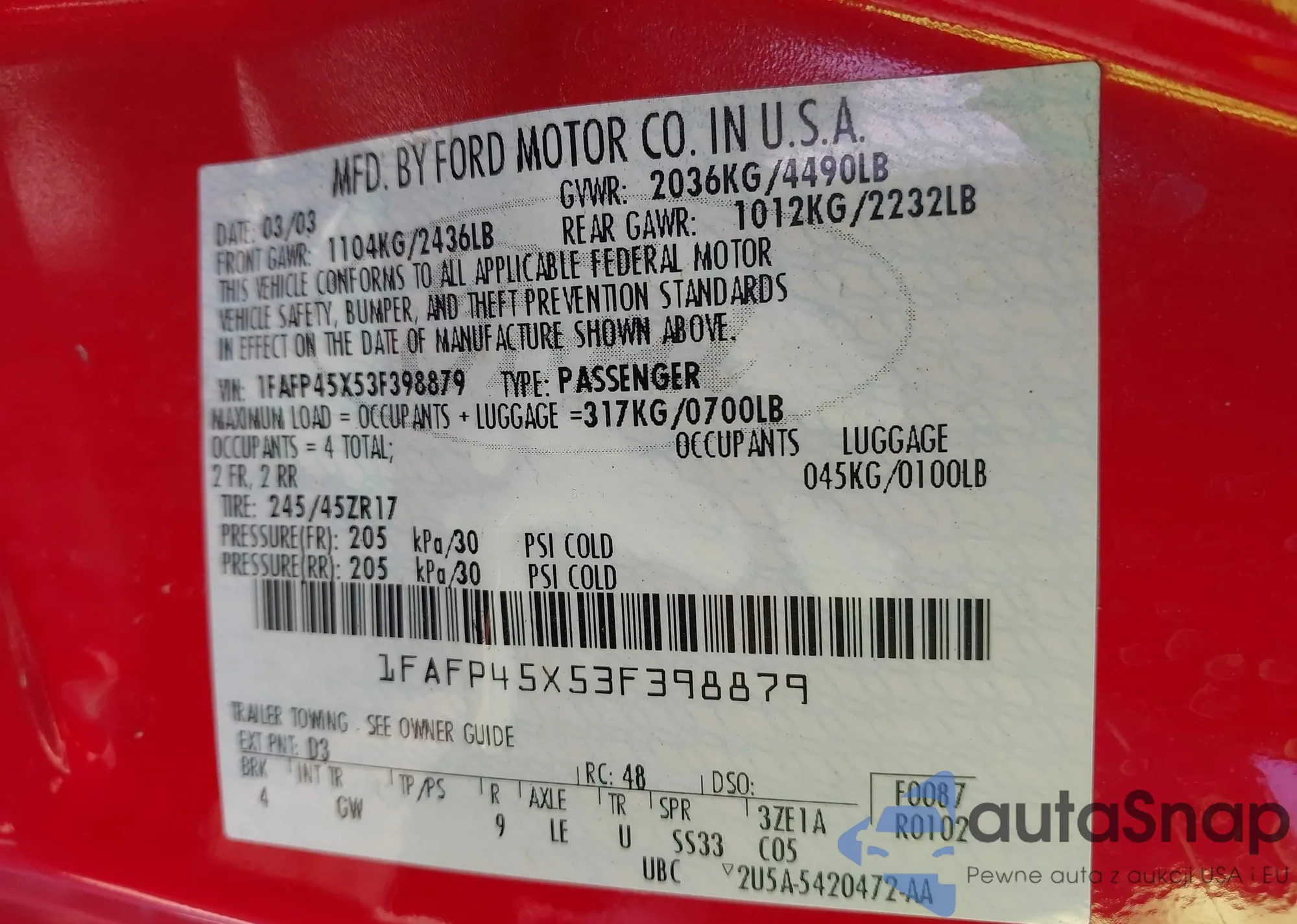 LOT: 43123943 VIN: 1FAFP45X53F398879