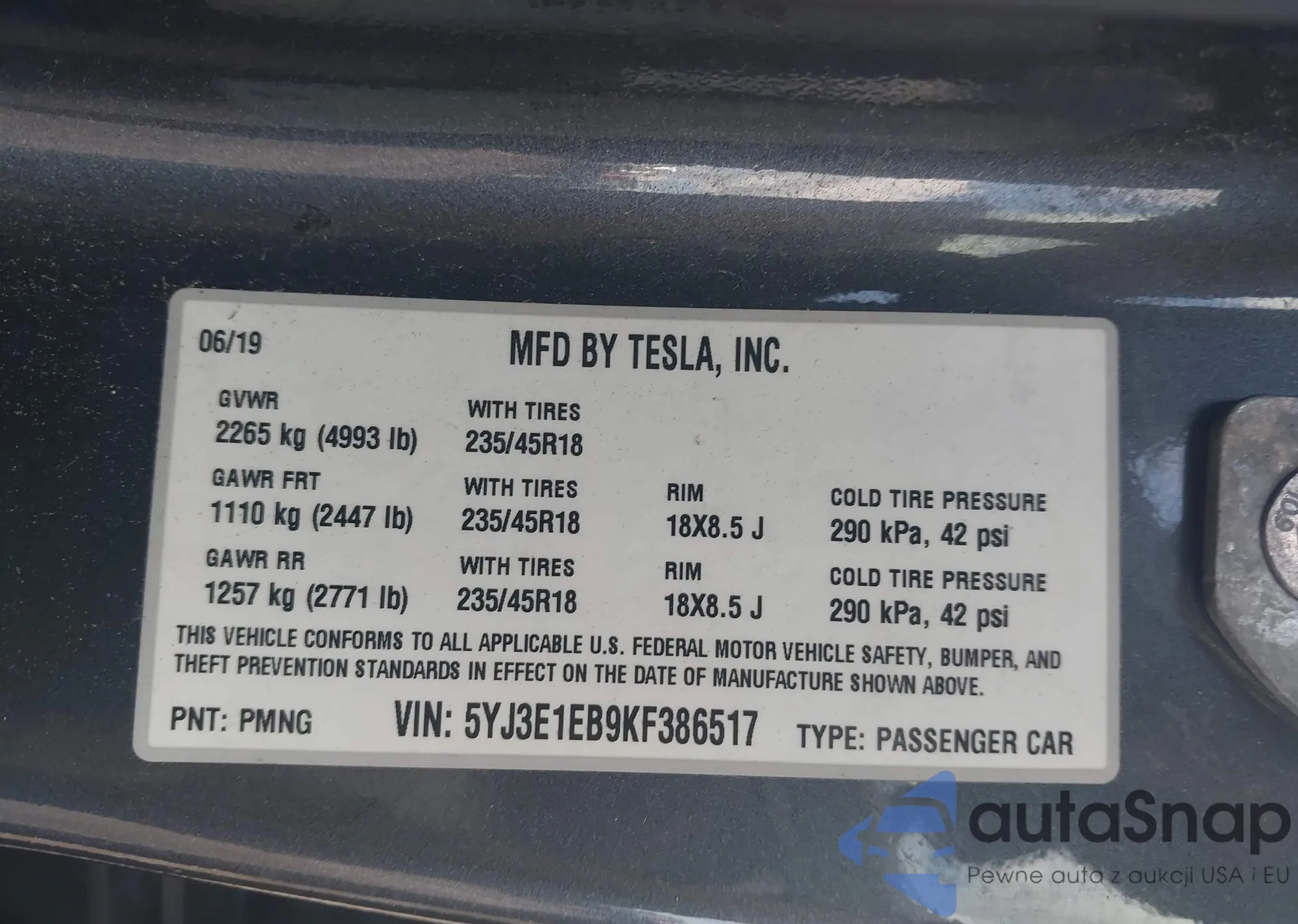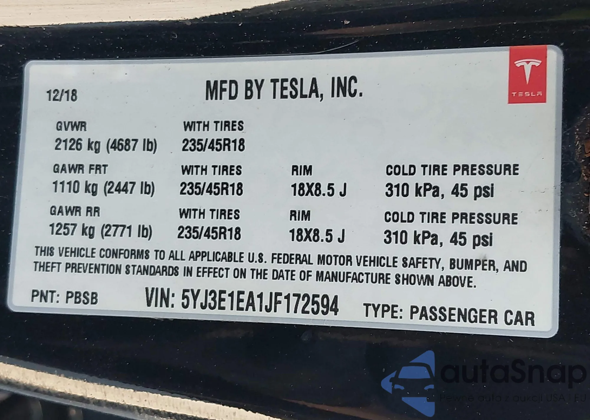 • VIN 5YJ3E1EA1JF172594