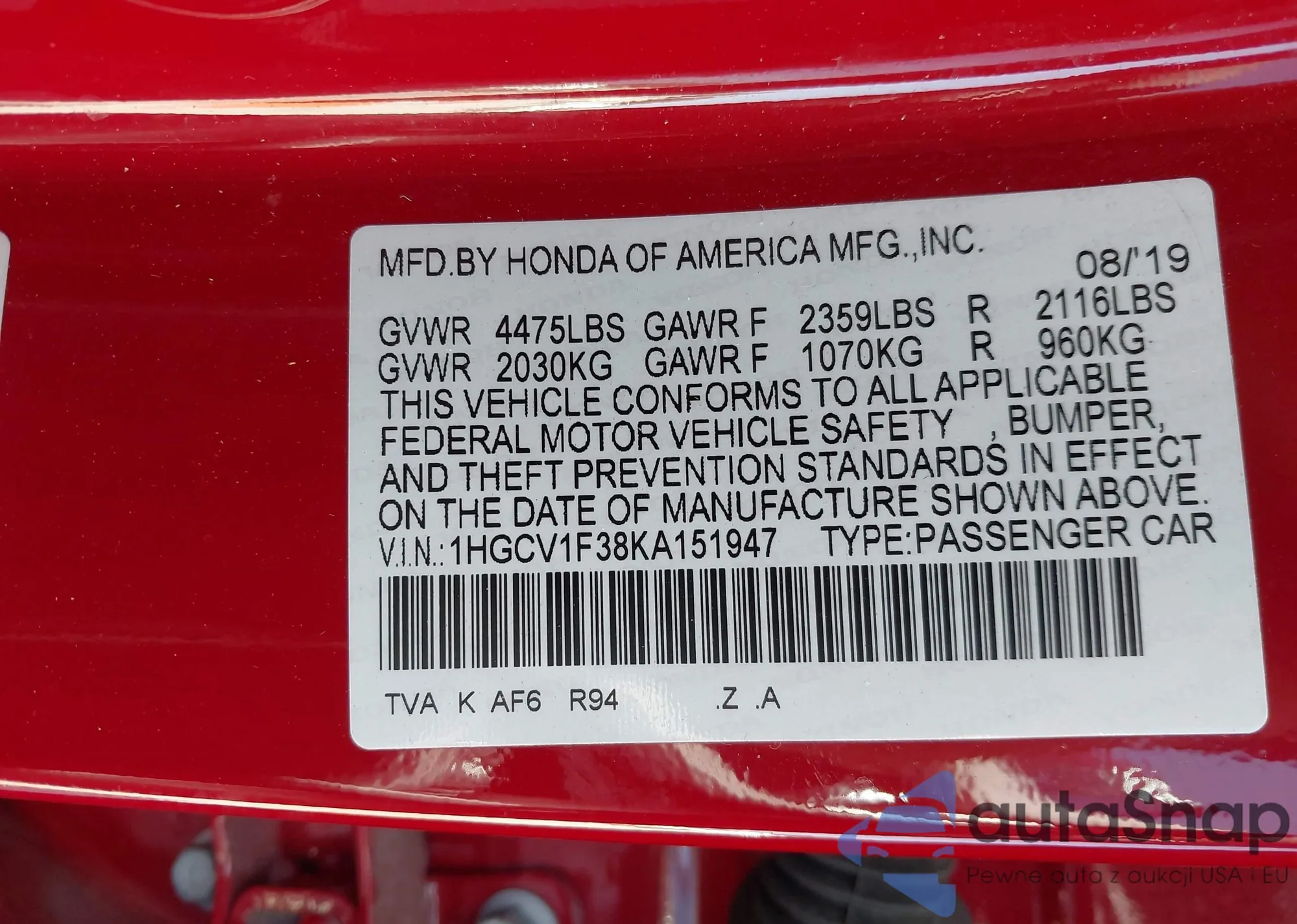 • VIN 1HGCV1F38KA151947