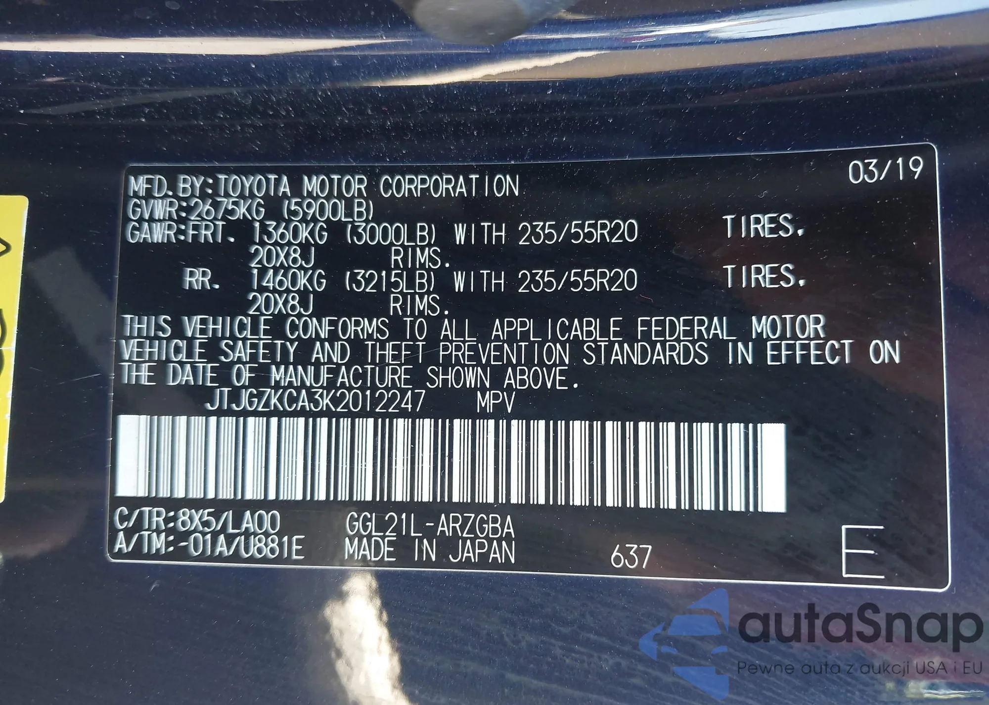 LOT: 43119637 VIN: JTJGZKCA3K2012247