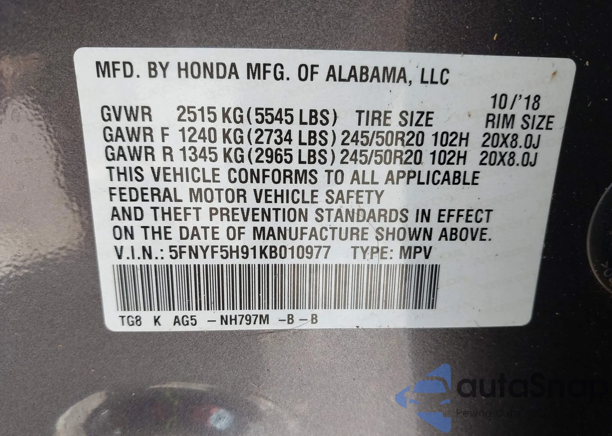 LOT: 43230074 VIN: 5FNYF5H91KB010977