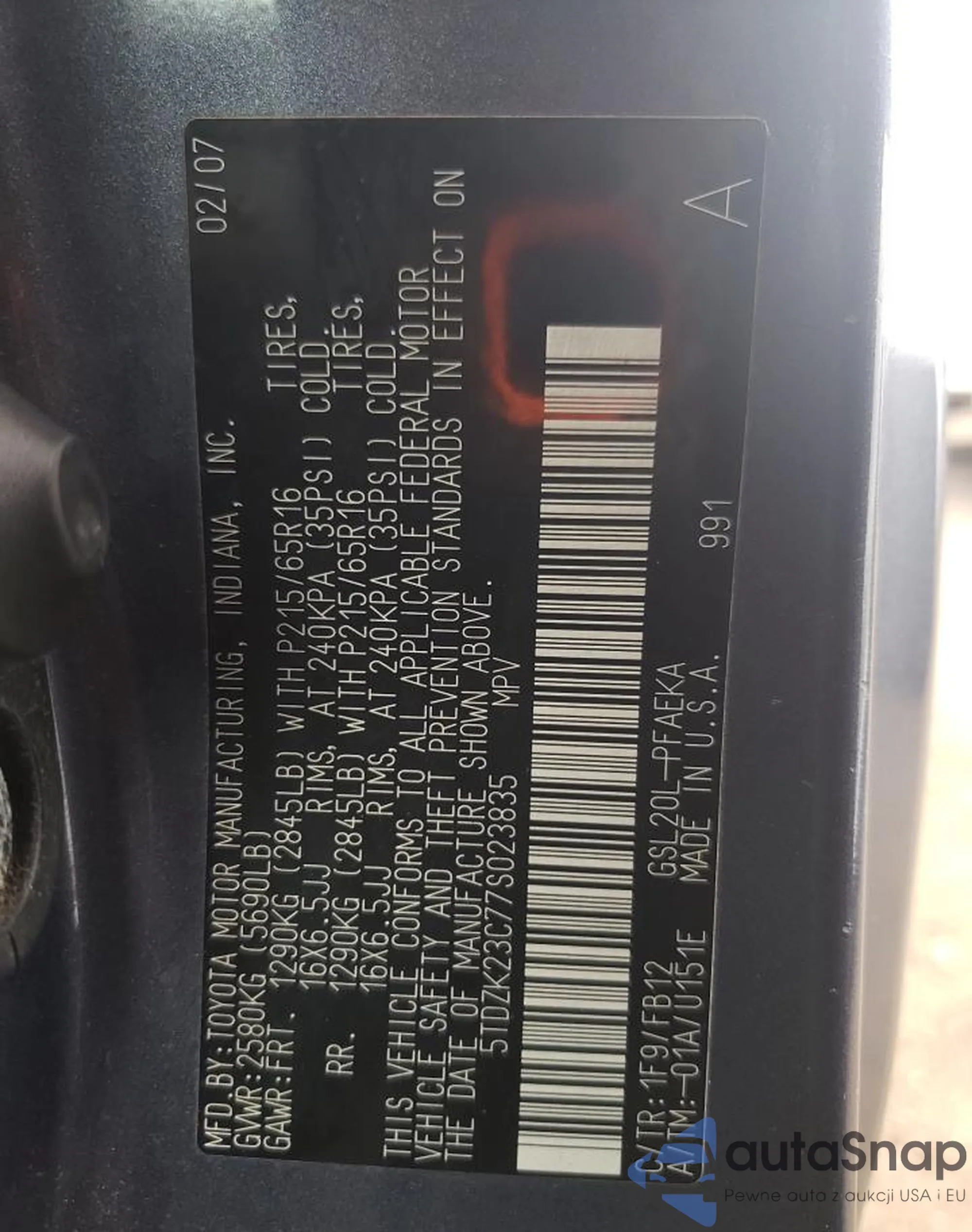 LOT: 64177985 VIN: 5TDZK23C77S023835