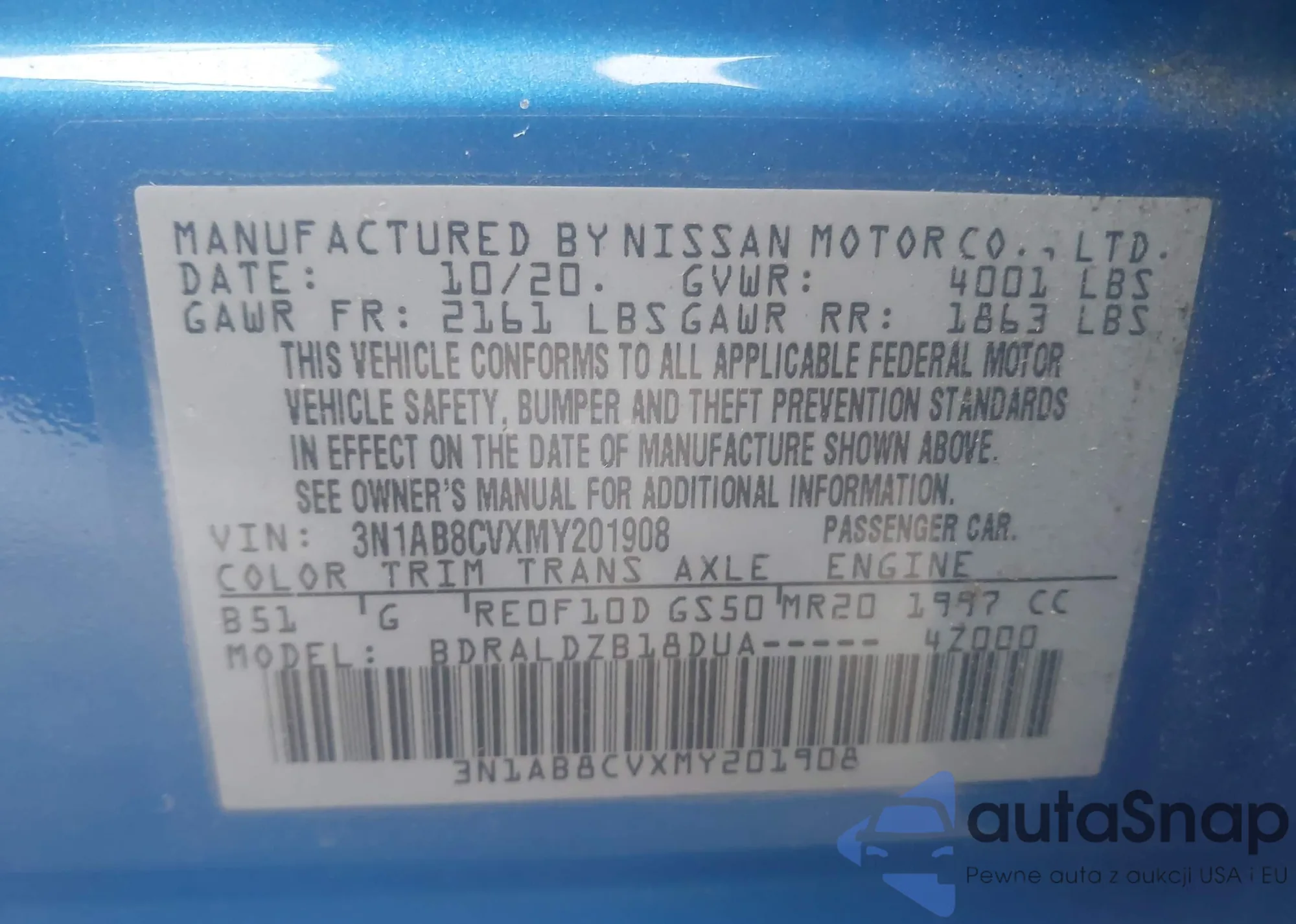LOT: 42940011 VIN: 3N1AB8CVXMY201908