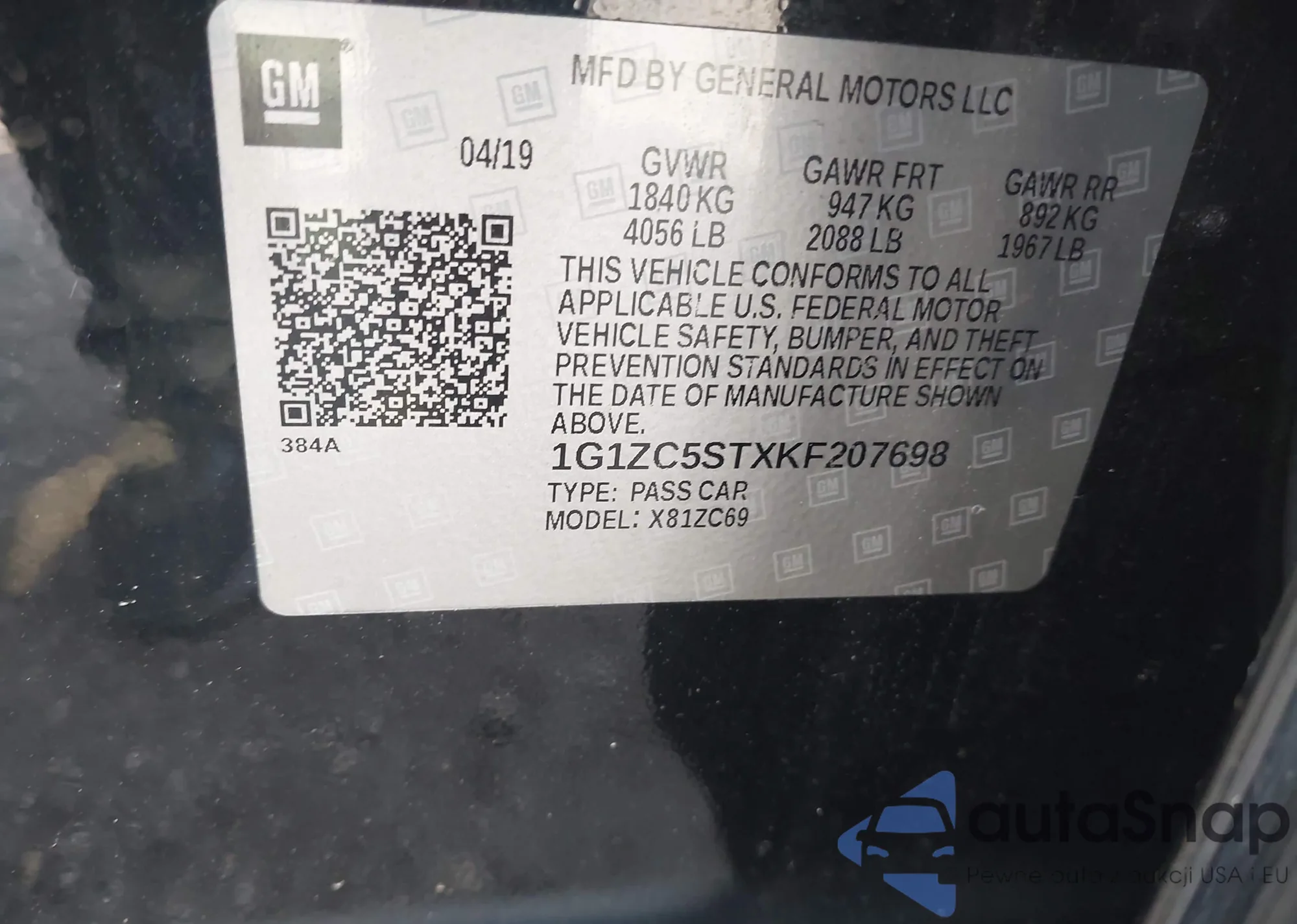 LOT: 42992635 VIN: 1G1ZC5STXKF207698