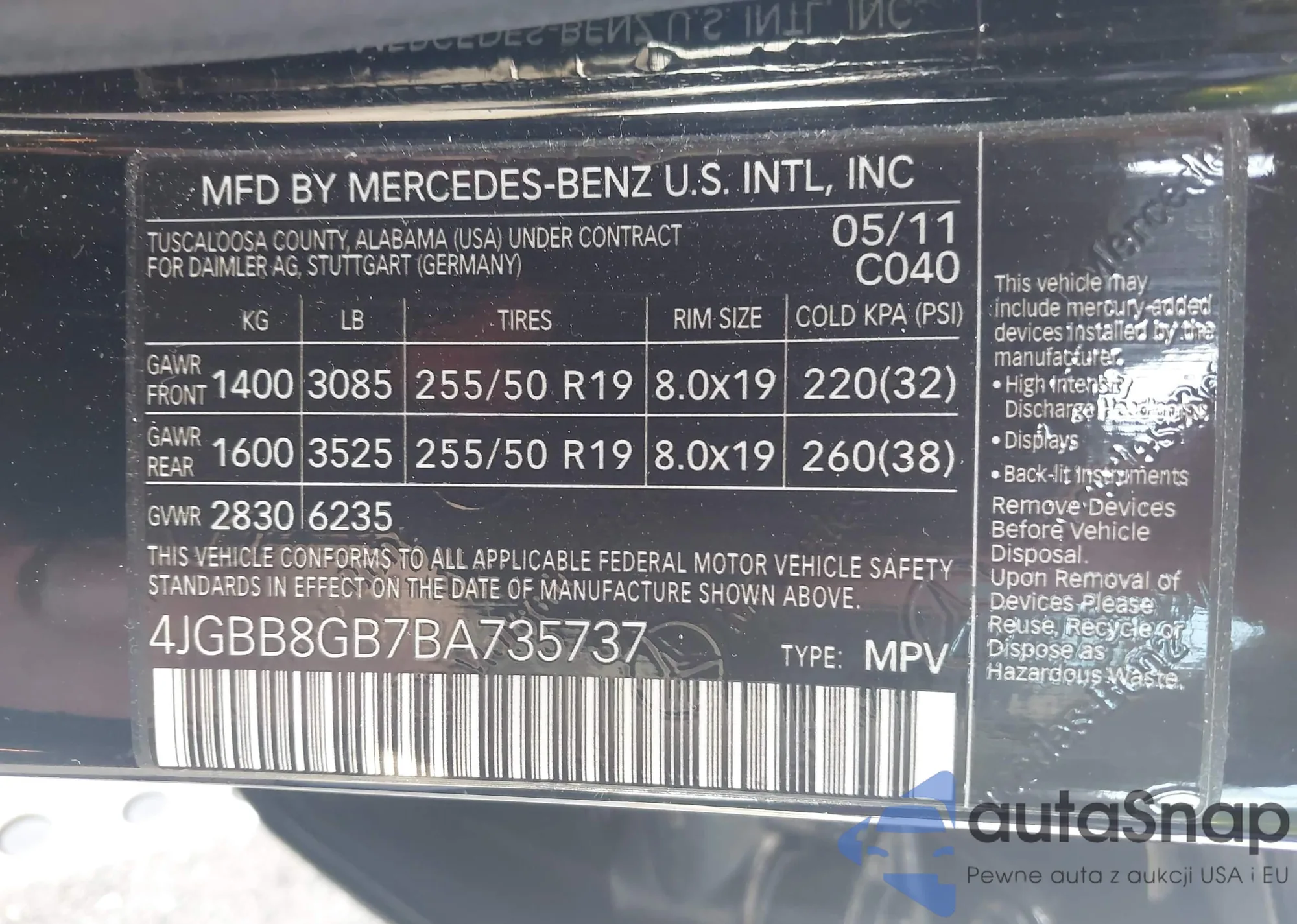 • VIN 4JGBB8GB7BA735737