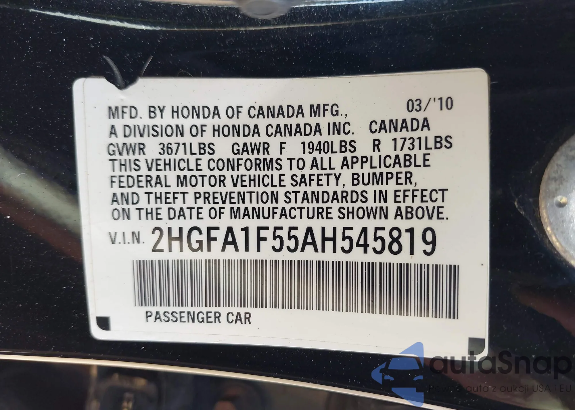 • VIN 2HGFA1F55AH545819