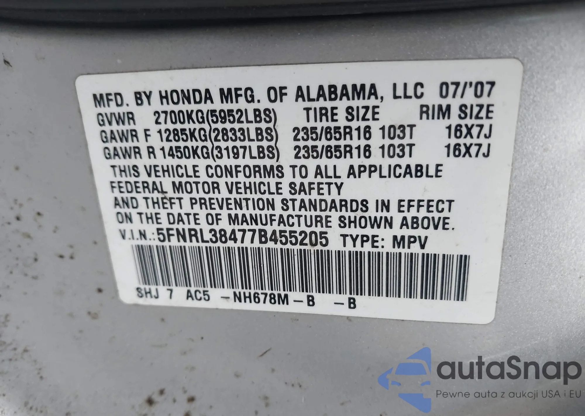 • VIN 5FNRL38477B455205