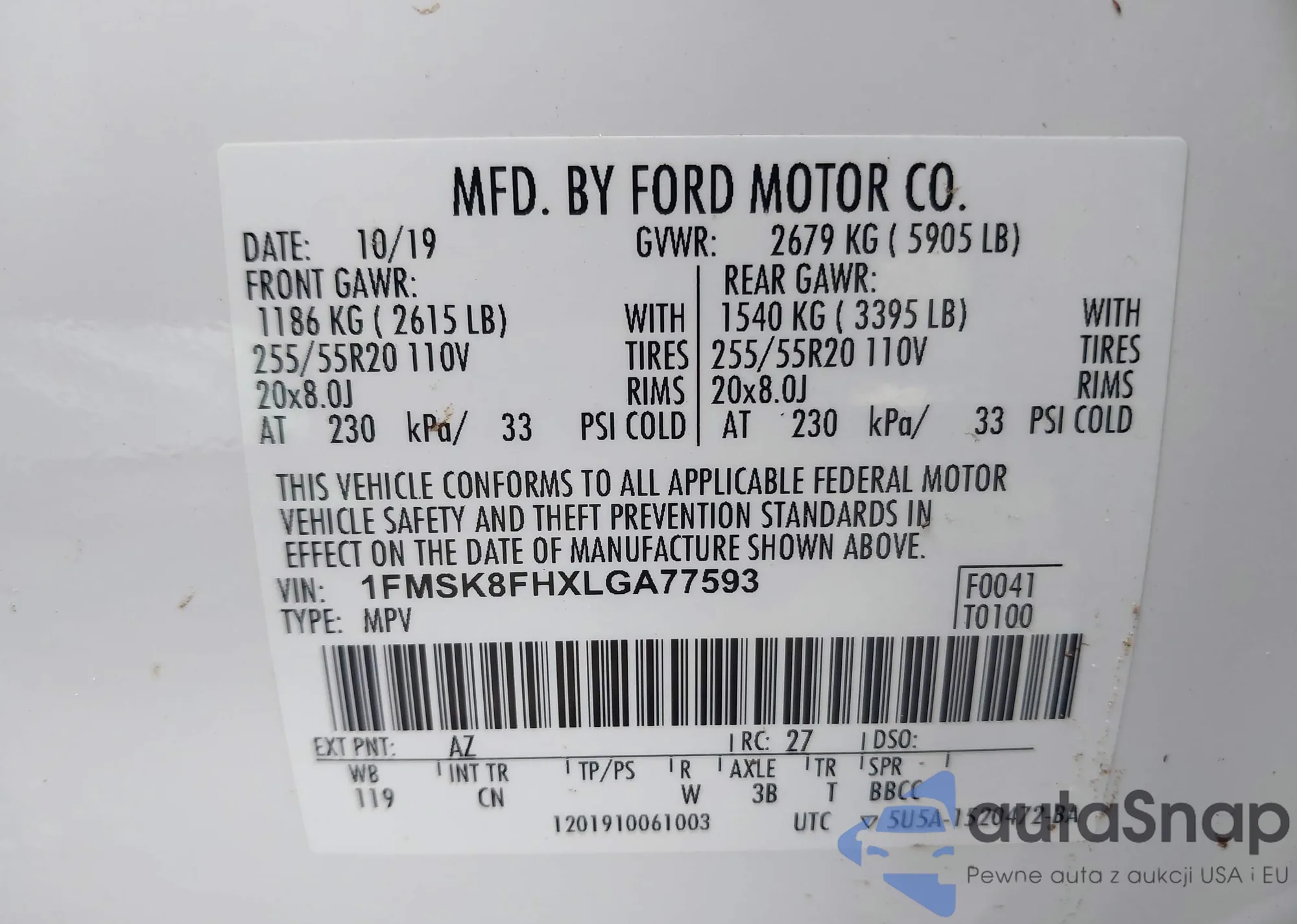 LOT: 42928941 VIN: 1FMSK8FHXLGA77593