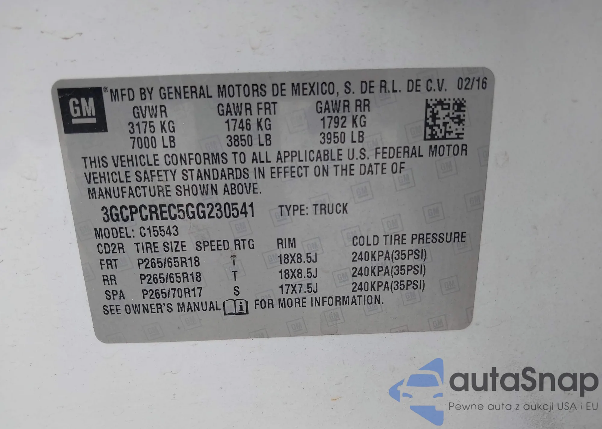 • VIN 3GCPCREC5GG230541