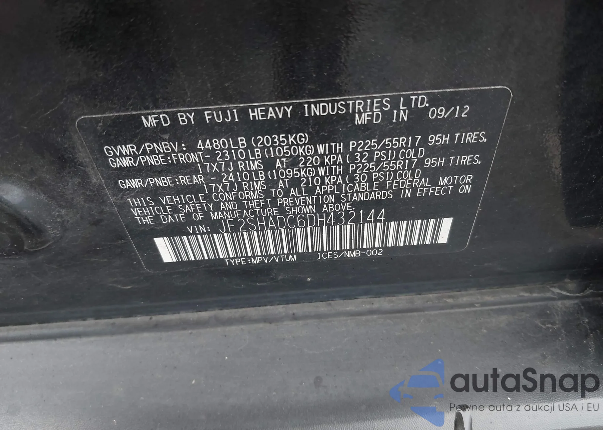 LOT: 43157731 VIN: JF2SHADC6DH432144