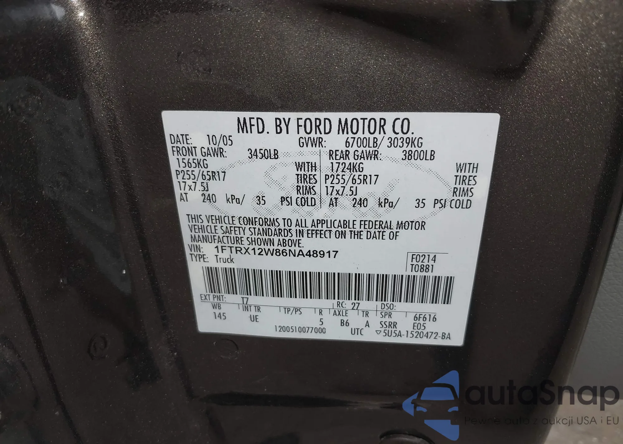• VIN 1FTRX12W86NA48917