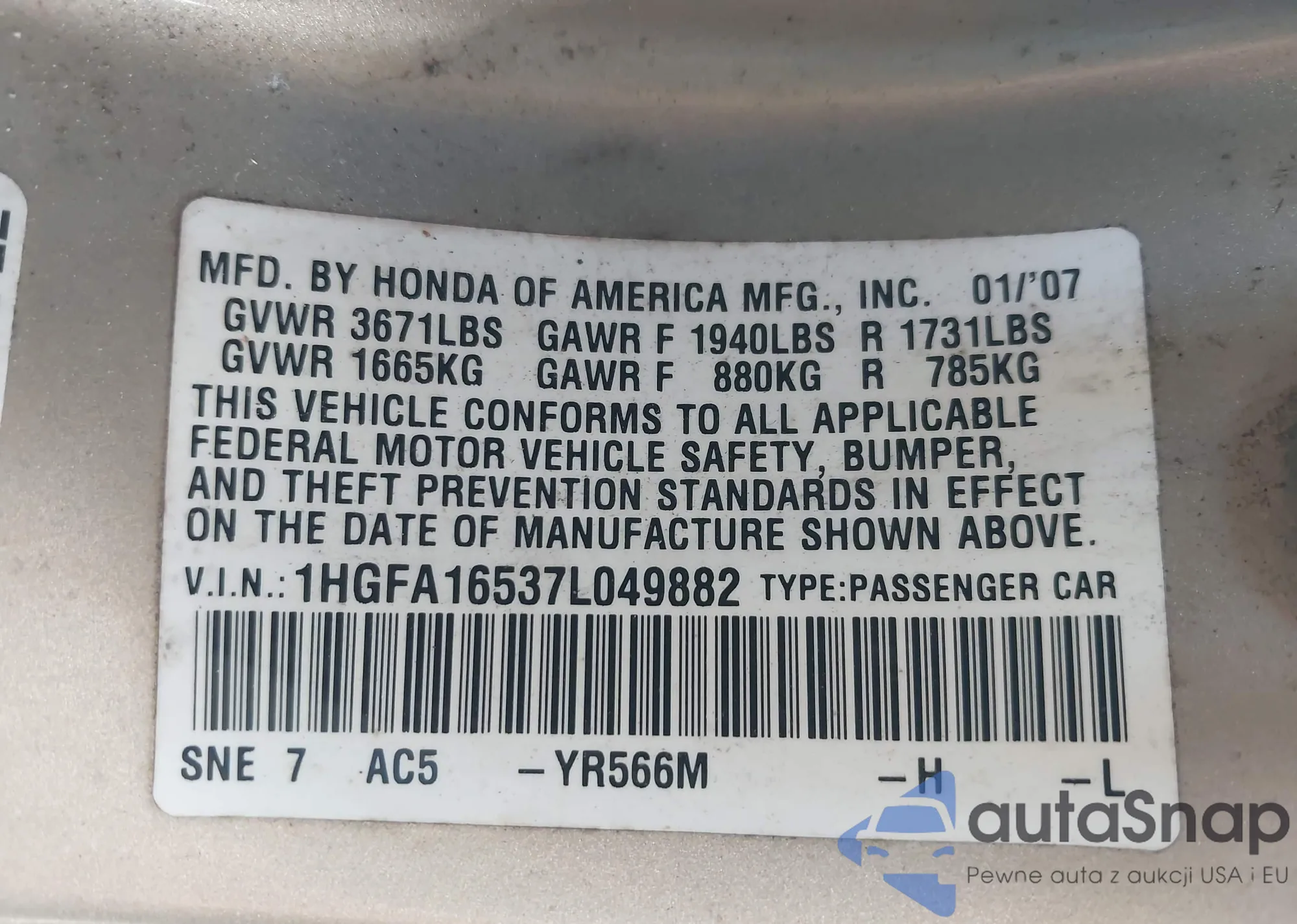 LOT: 43199581 VIN: 1HGFA16537L049882