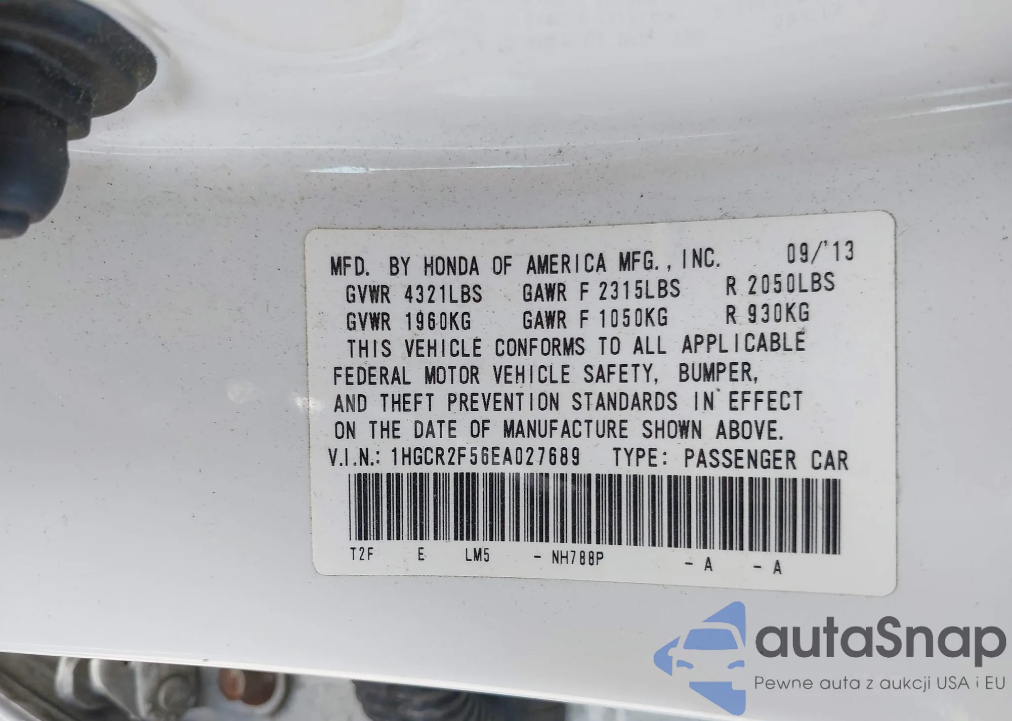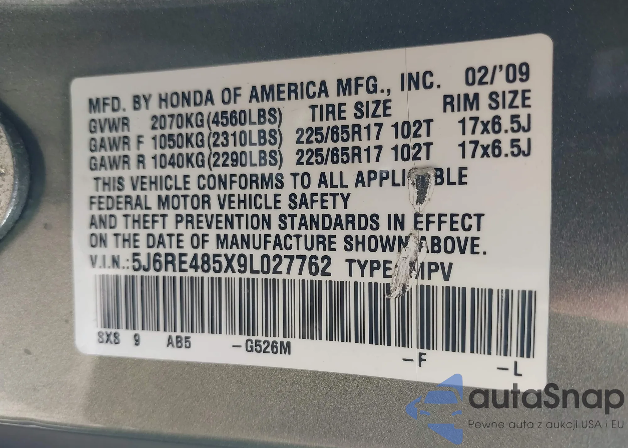 • VIN 5J6RE485X9L027762