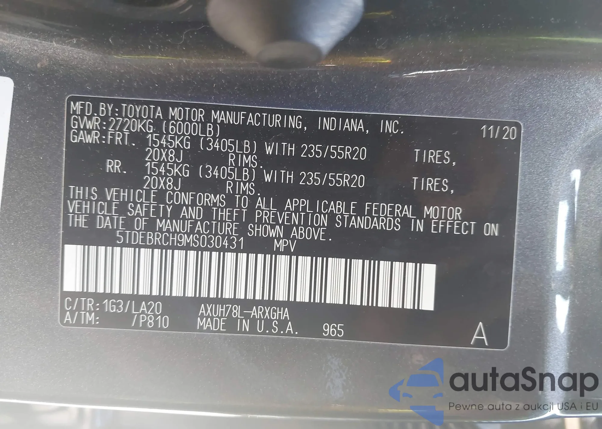 LOT: 42902645 VIN: 5TDEBRCH9MS030431