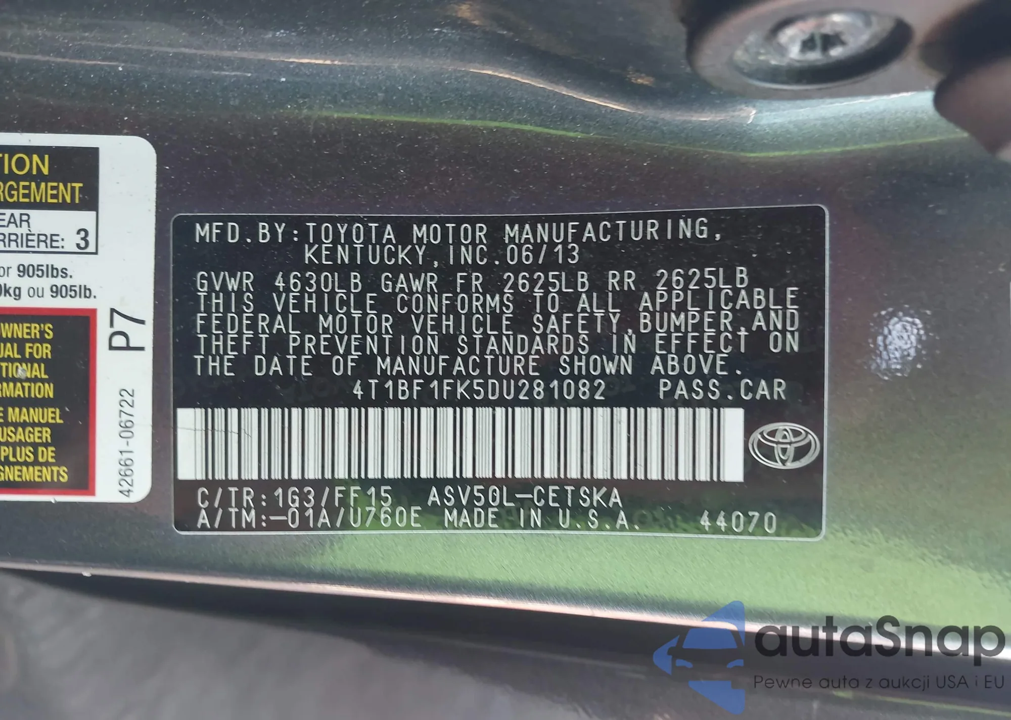 LOT: 43231283 VIN: 4T1BF1FK5DU281082