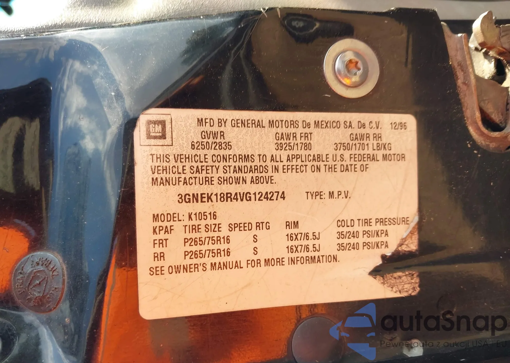 • VIN 3GNEK18R4VG124274