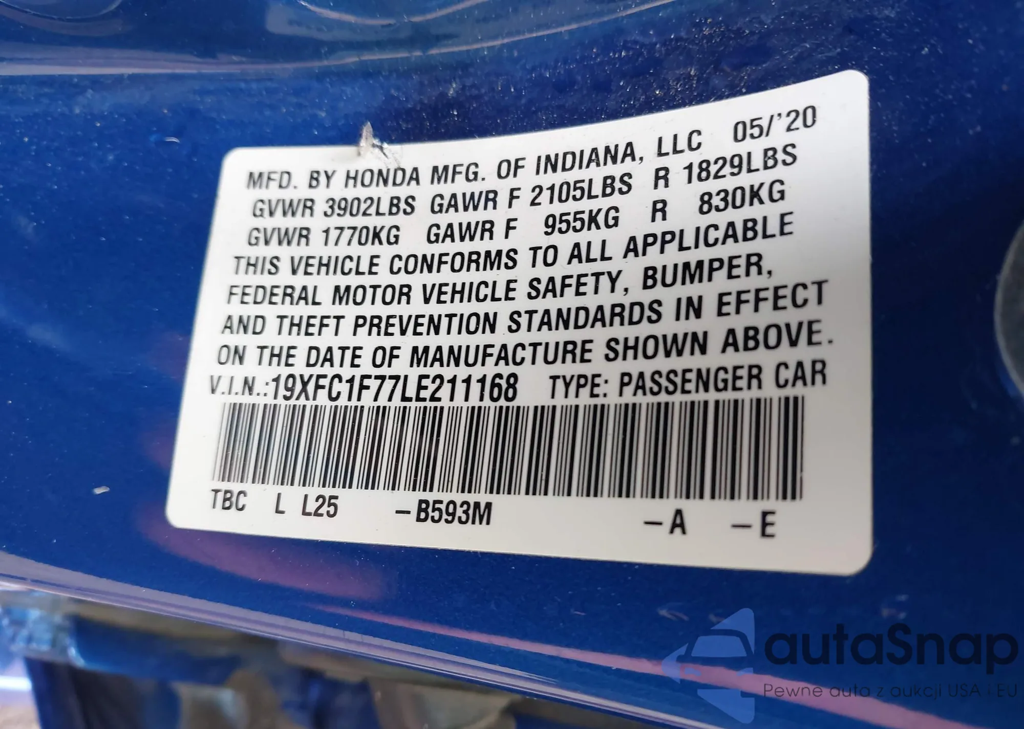 LOT: 43066205 VIN: 19XFC1F77LE211168